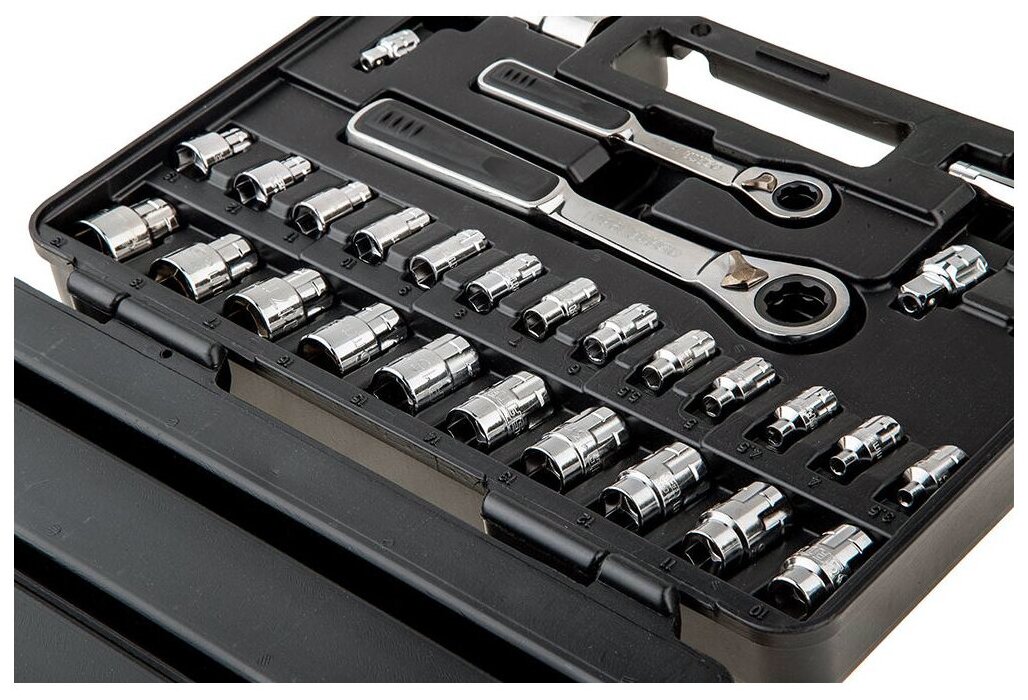 | Головки торцевые подробно | 1/4": 3.5, 4, 4,5, 5, 5,5, 6, 7, 8, 9, 10, 11, 12, 13 мм; трещотка 1/4"; удлинитель 1/4": 75 мм; 3/8": 10, 11, 12, 13, 14, 15, 16, 17, 18, 19 мм; трещотка 3/8"; удлинитель 3/8": 75 мм |