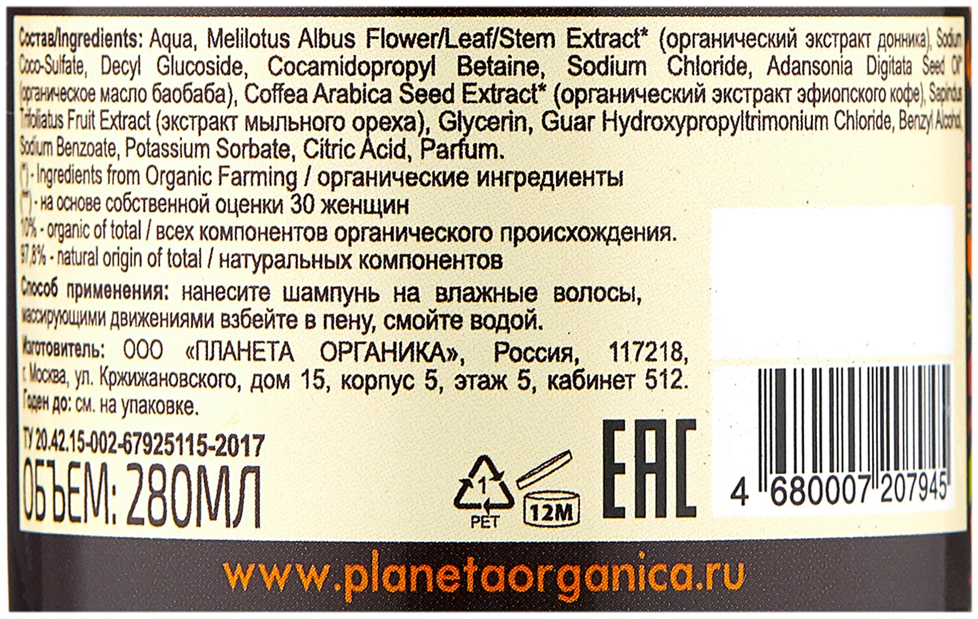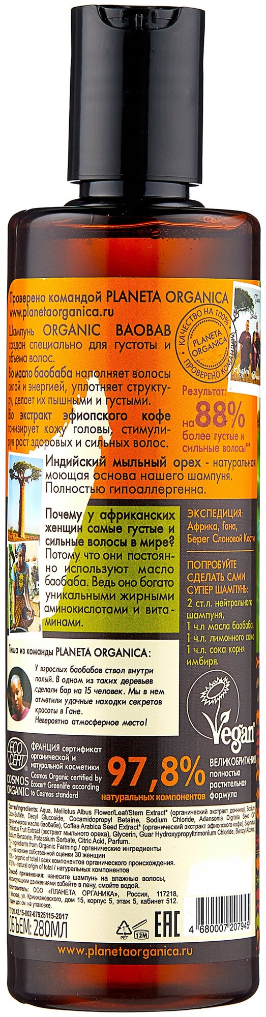 Шампунь для волос органический Planeta Organica Organic baobab, 280 мл информация: