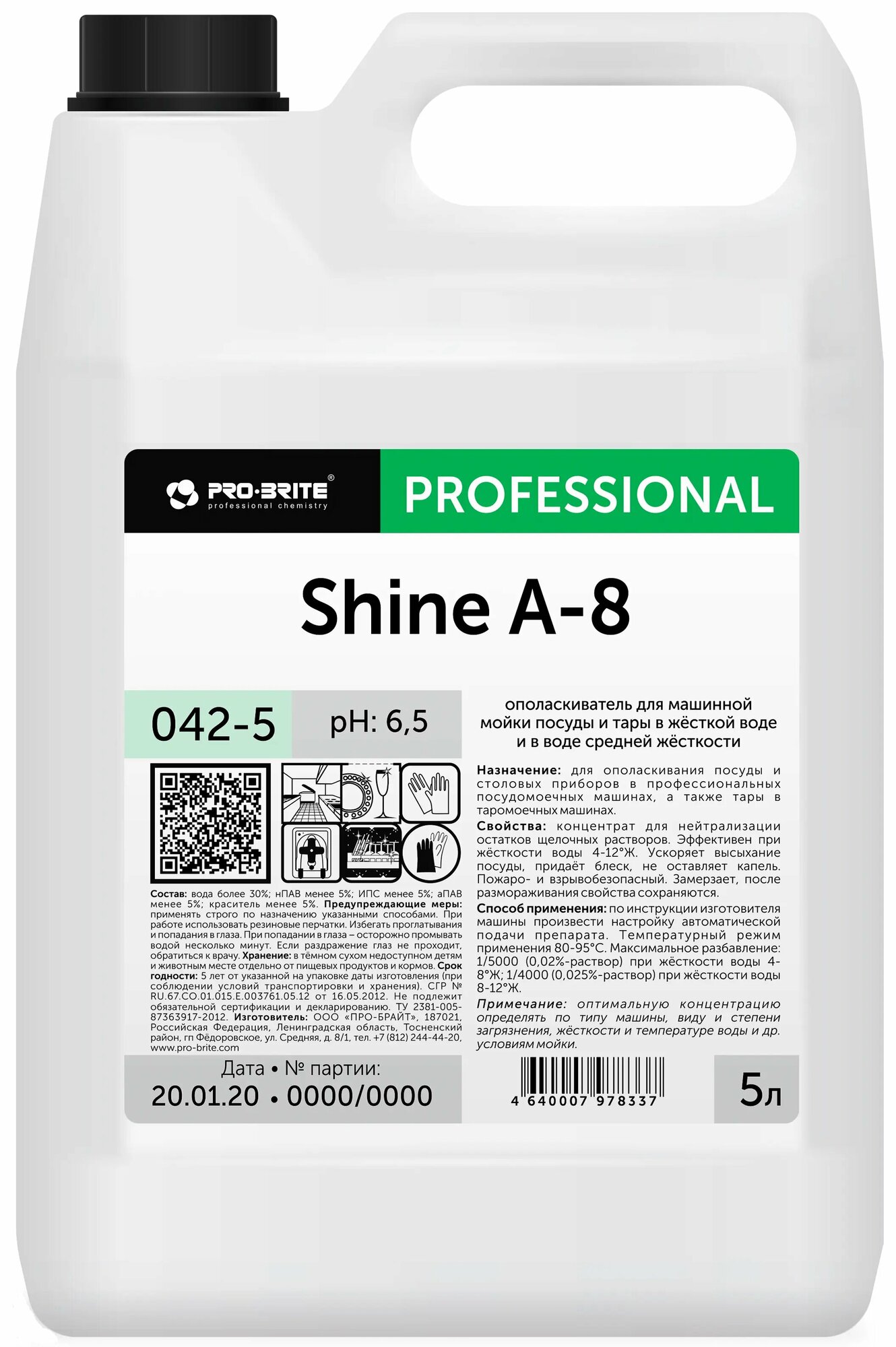 Средство для мытья посуды в посудомоечных машинах 5 л, PRO-BRITE SHINE А-8, ополаскиватель, концентрат, 042-5, 1 шт информация: