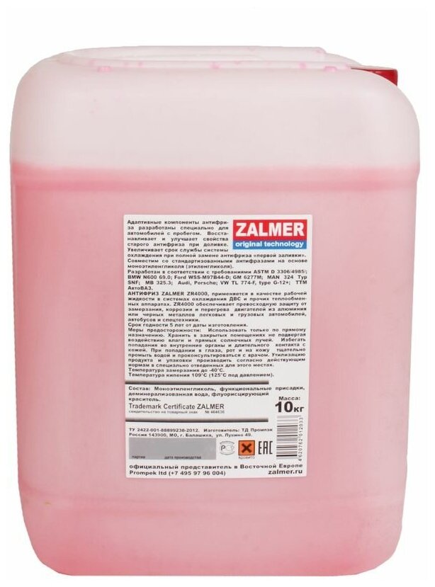 Антифриз ZALMER ZR4000 G12+ красный 10кг информация: