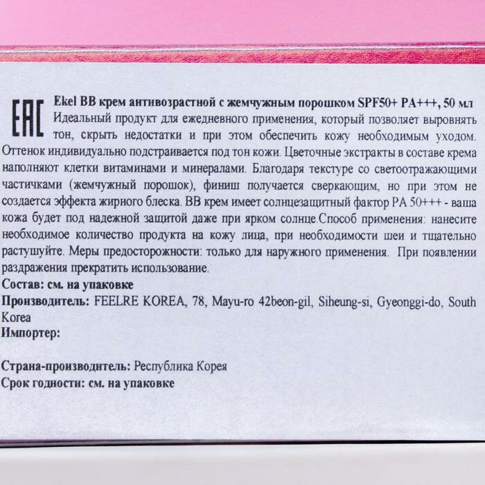 BB-крем Ekel, антивозрастной с жемчужным порошком SPF 50+/PA+++ 50 мл информация: