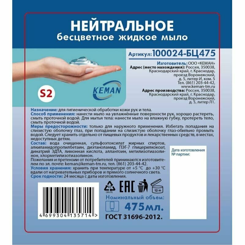 Картридж с жидким мылом KEMAN нейтральное бесцветное S2 475мл 100024-БЦ475, 1 шт. информация: