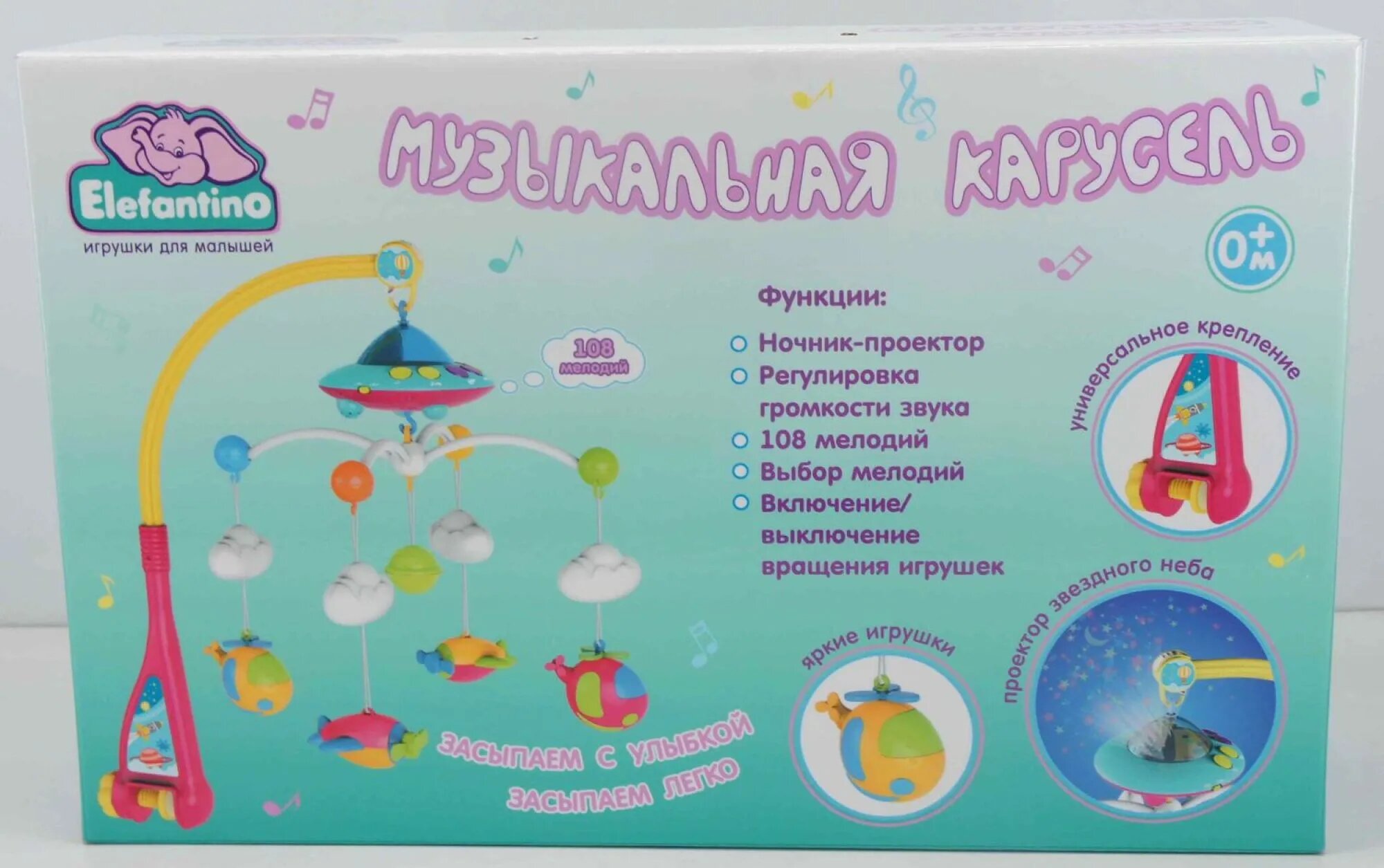 Музыкальная карусель на кроватку "Elefantino" на бат. ночник-проектор, 108 нежных мелодий, информация: