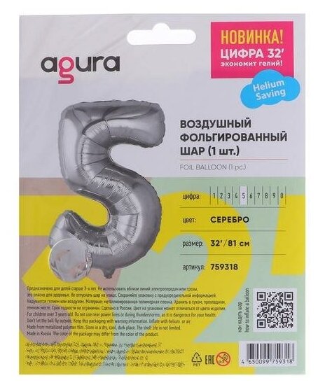 Шар фольгированный 32" «Цифра 5», цвет серебристый информация: