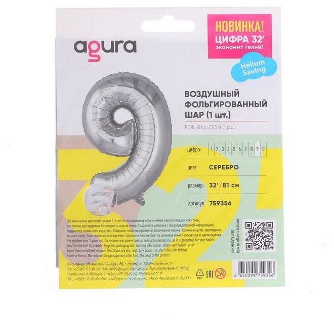 Шар фольгированный 32" «Цифра 9», цвет серебристый информация: