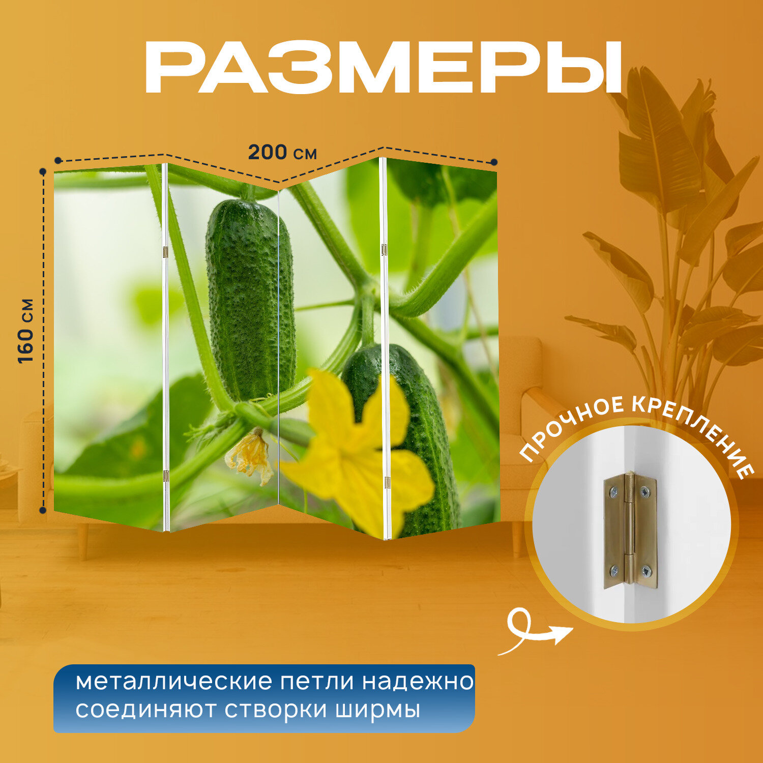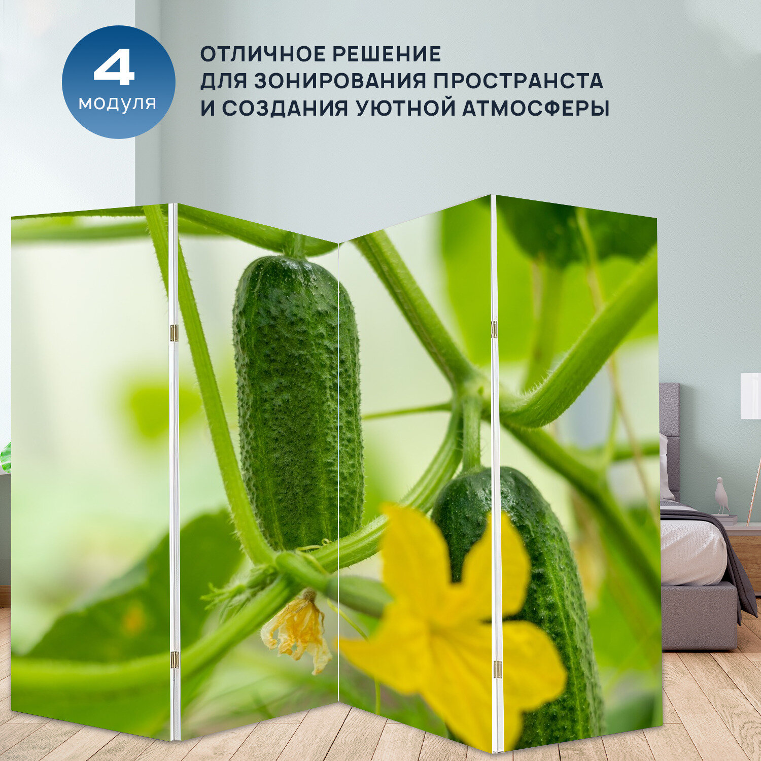Отзывы на Ширма перегородка с принтом "Огурец, зеленый, овощи" на холсте - 200x160 см. для зонирования, раскладная