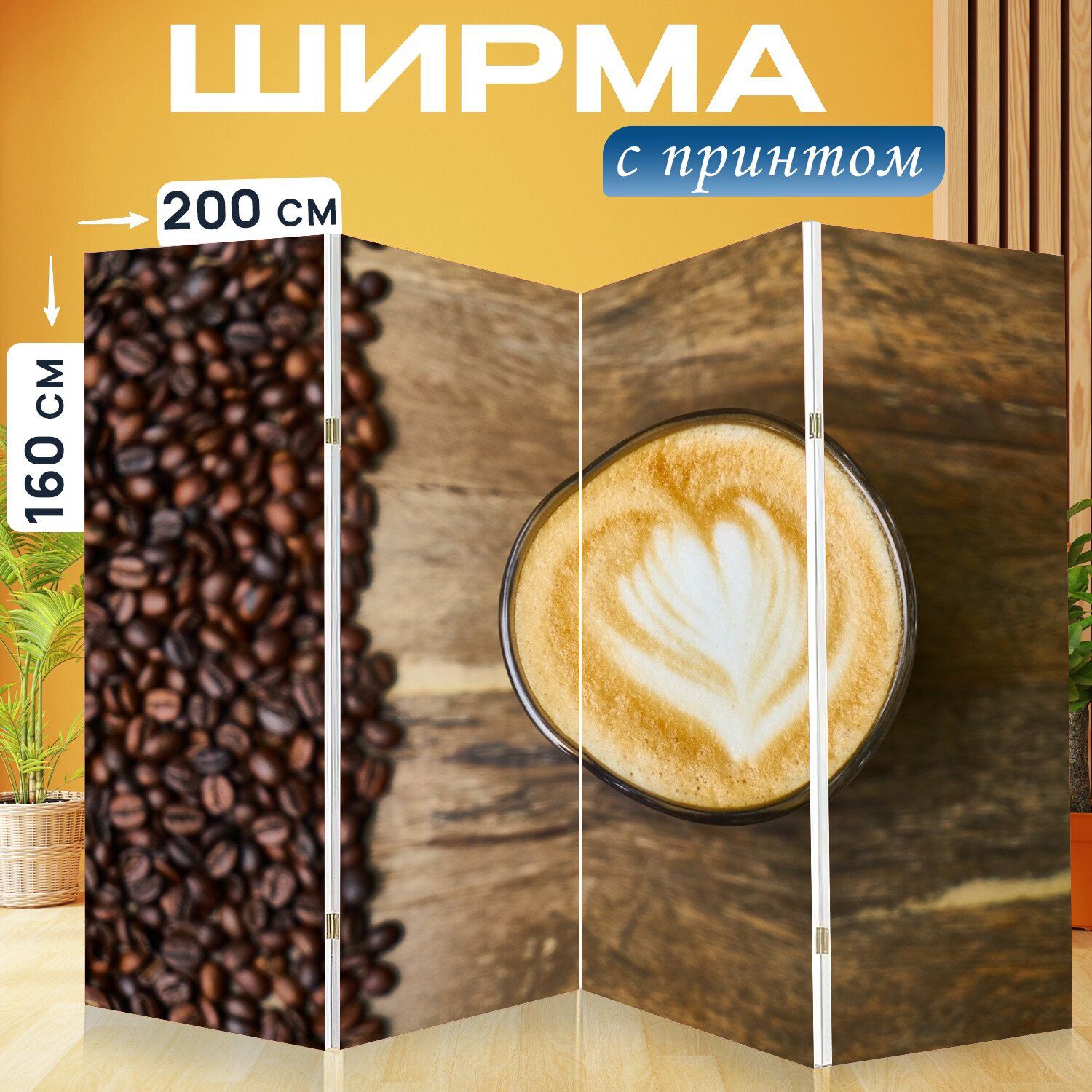 10 цен на Ширма перегородка с принтом "Кофе, кофеин, чашка" на холсте - 200x160 см. для зонирования, раскладная
