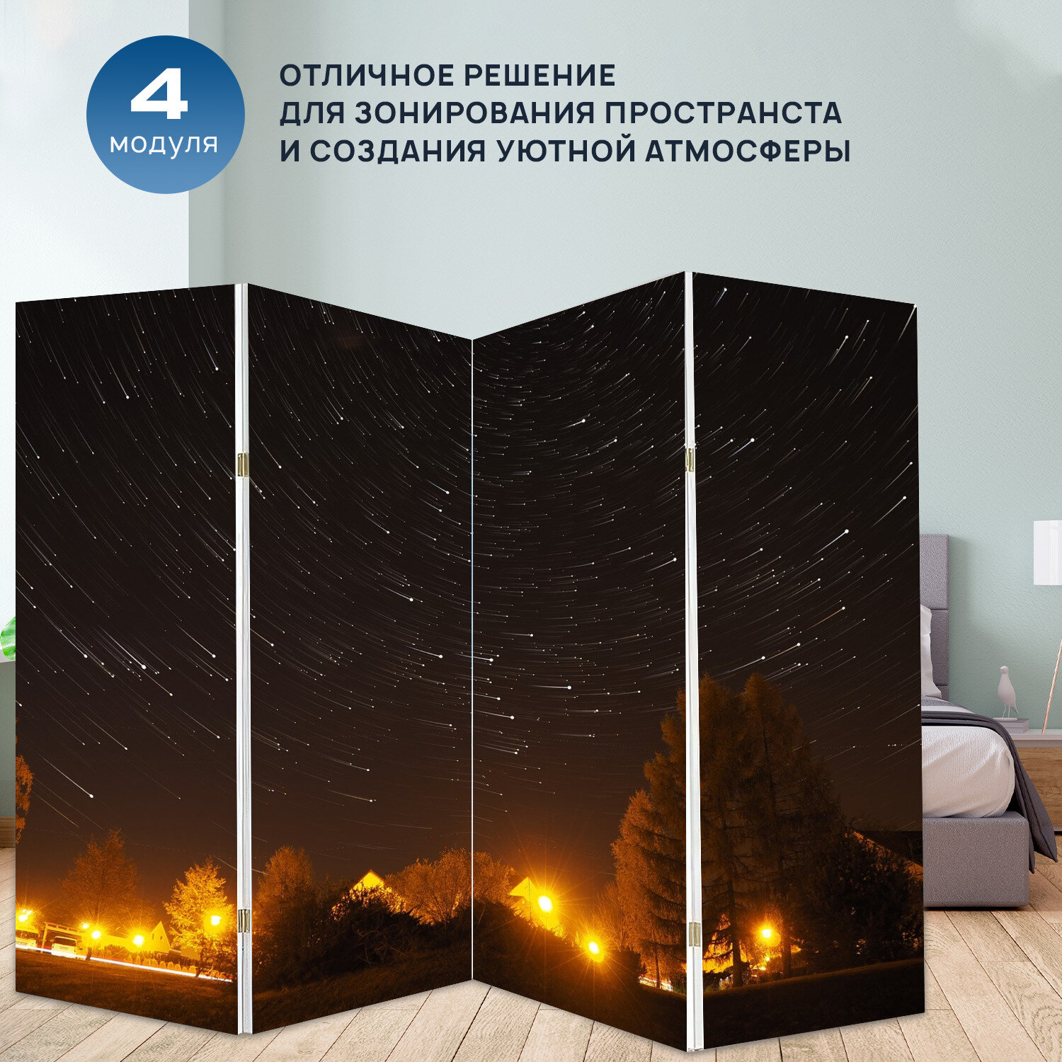 Отзывы на Ширма перегородка с принтом "Звезды, ночь, свет" на холсте - 200x160 см. для зонирования, раскладная