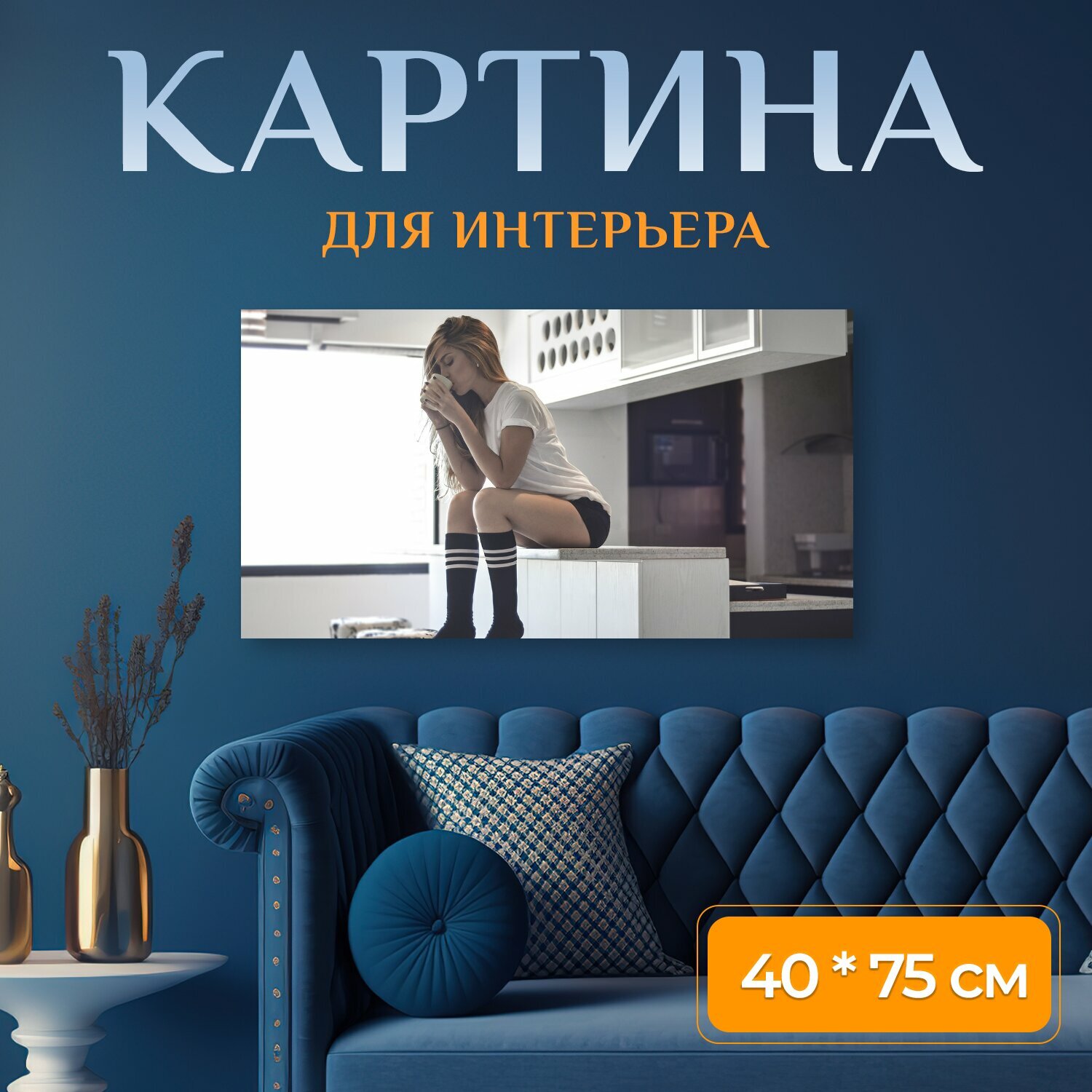 10 цен на Картина на холсте "Модель, женщина, кофе" на подрамнике 75х40 см. для интерьера