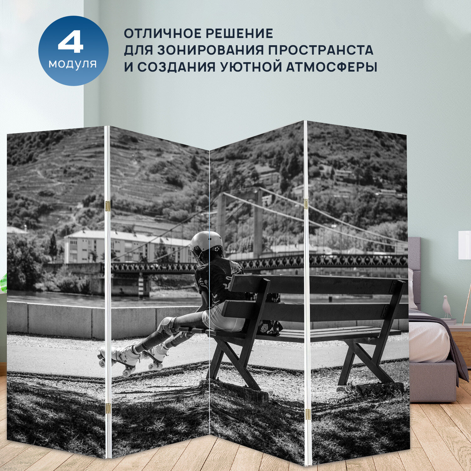 Ширма перегородка с принтом "Катание на роликах, девочка, ролик" на холсте - 200x160 см. для зонирования, раскладная информация:
