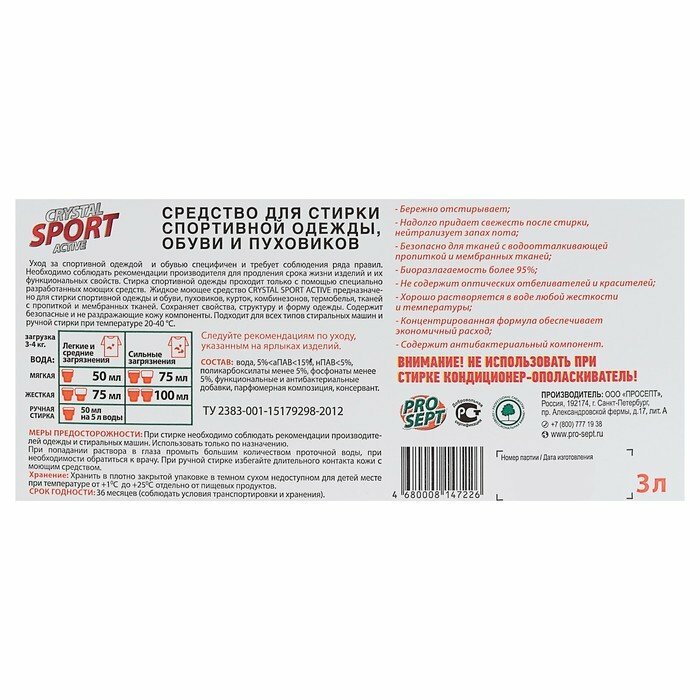 PROSEPT Средство для стирки Crystal спортивной одежды, обуви и пуховиков, 3л информация: