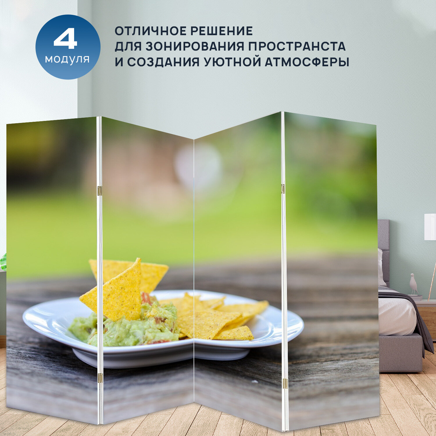 10 цен на Ширма перегородка с принтом "Перекус, начос, гуакамоле" на холсте - 200x160 см. для зонирования, раскладная