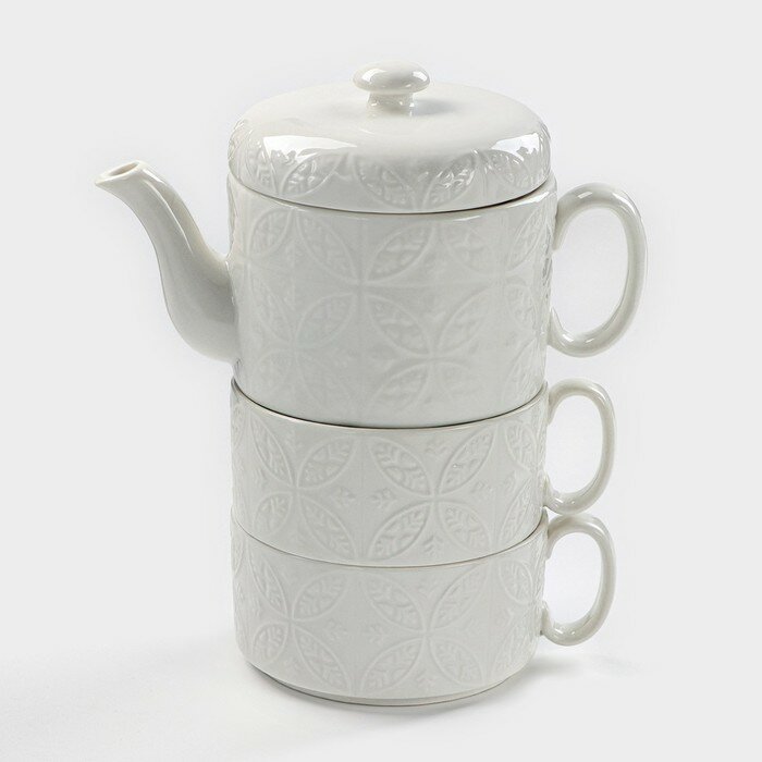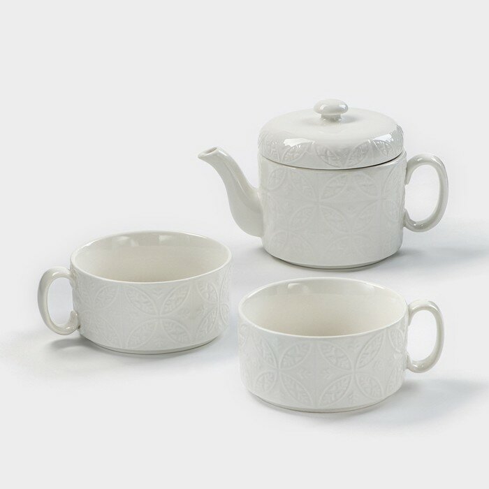 Набор фарфоровый чайный Доляна «Эстет. Орнамент», 3 предмета: чайник 400 мл, 2 кружки 280 мл, цвет белый информация: