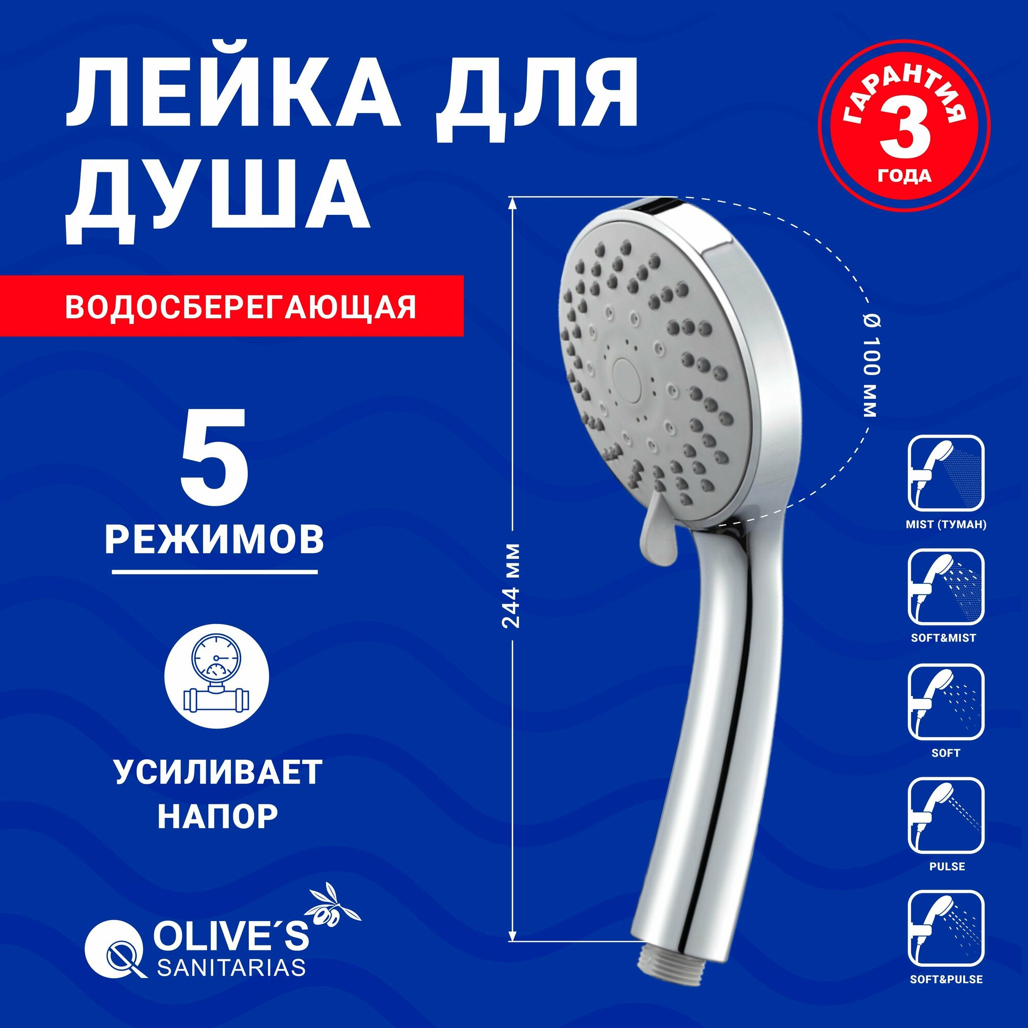 Лейка для душа Olive's SANITARIAS массажная, водосберегающая, 100мм, 5 режимов, хром, D165 1 209 ₽