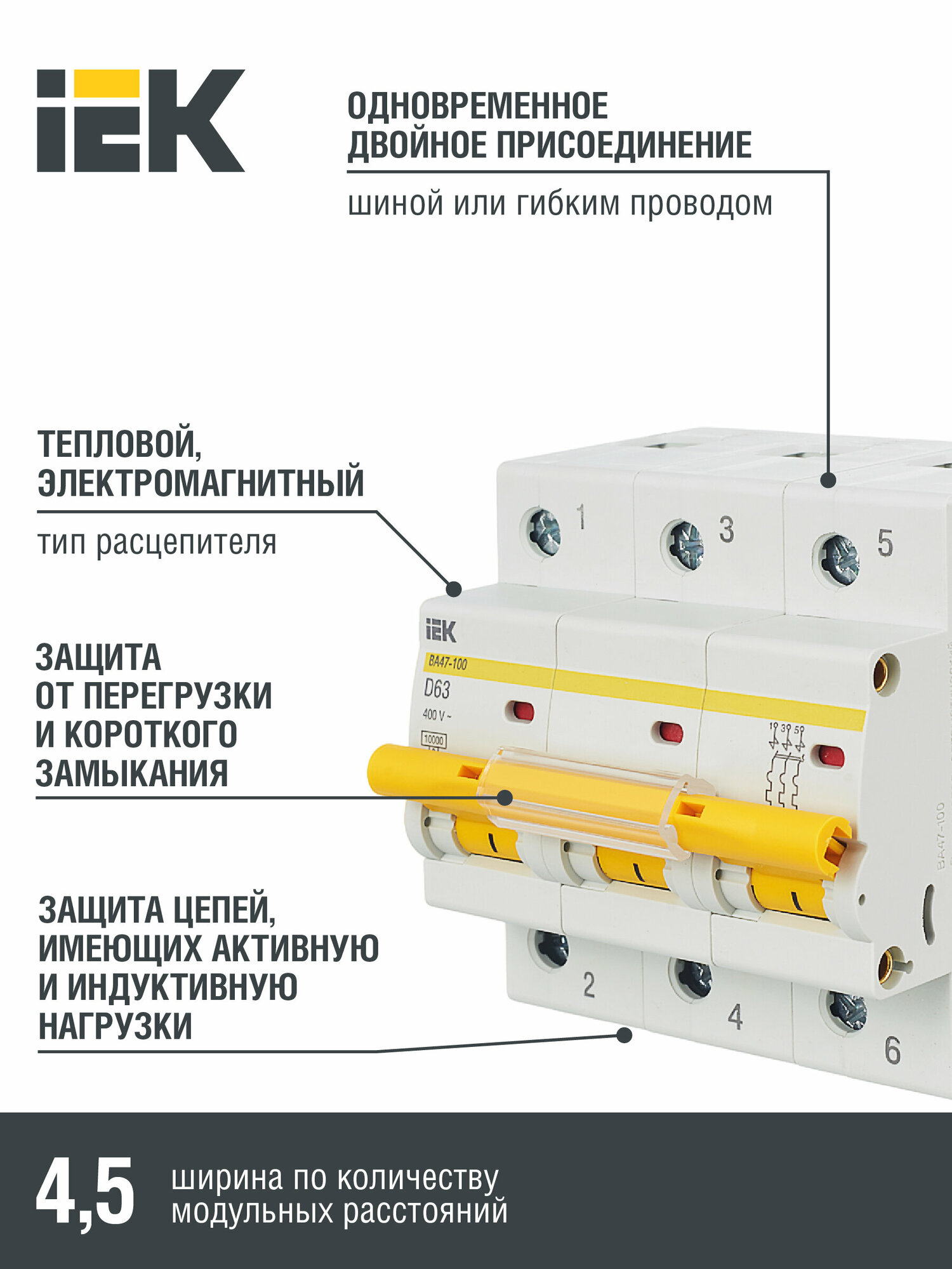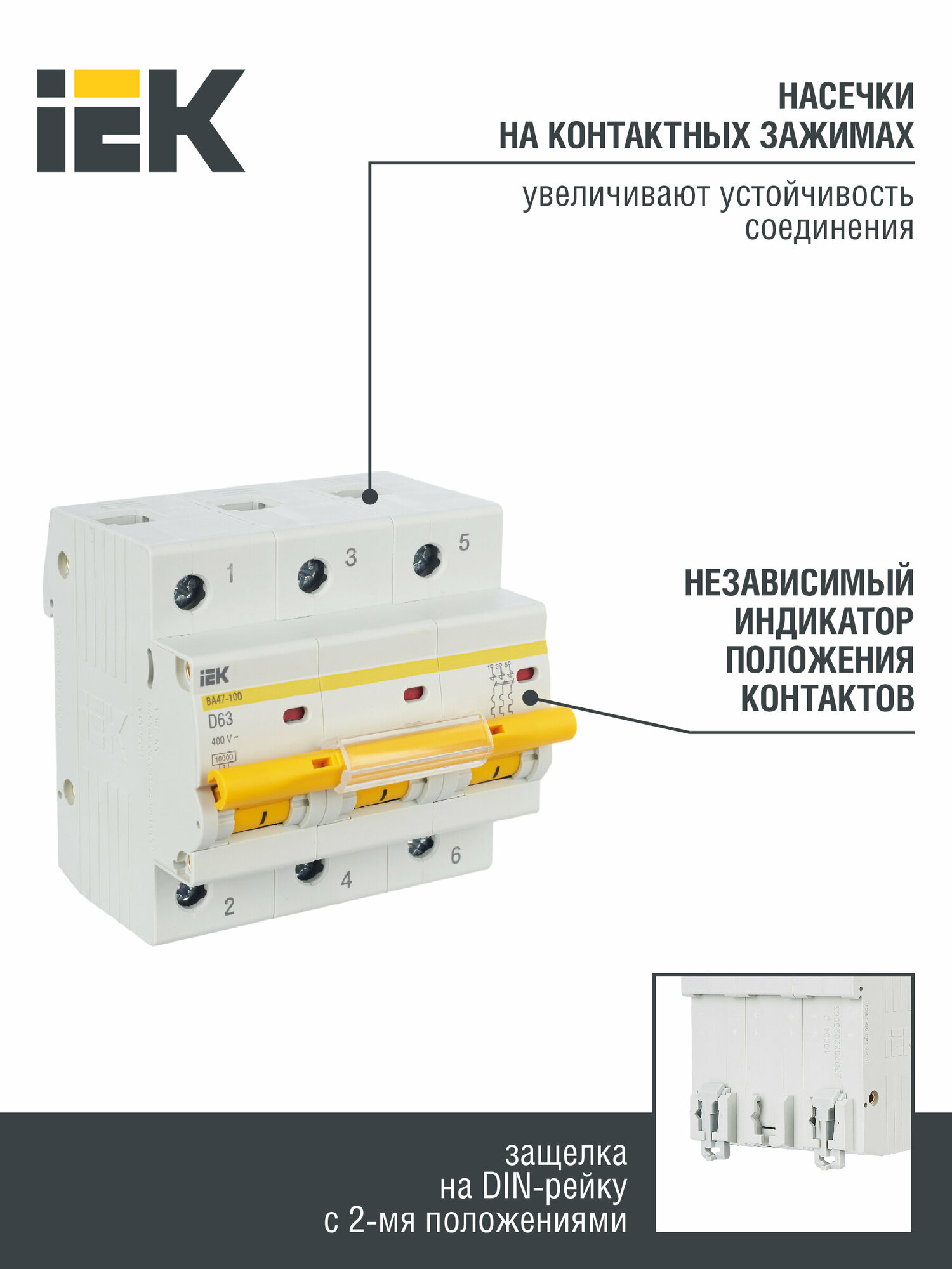 Выключатель автоматический трехполюсный ВА47-100 63А D 10кА MVA40-3-063-D IEK информация: