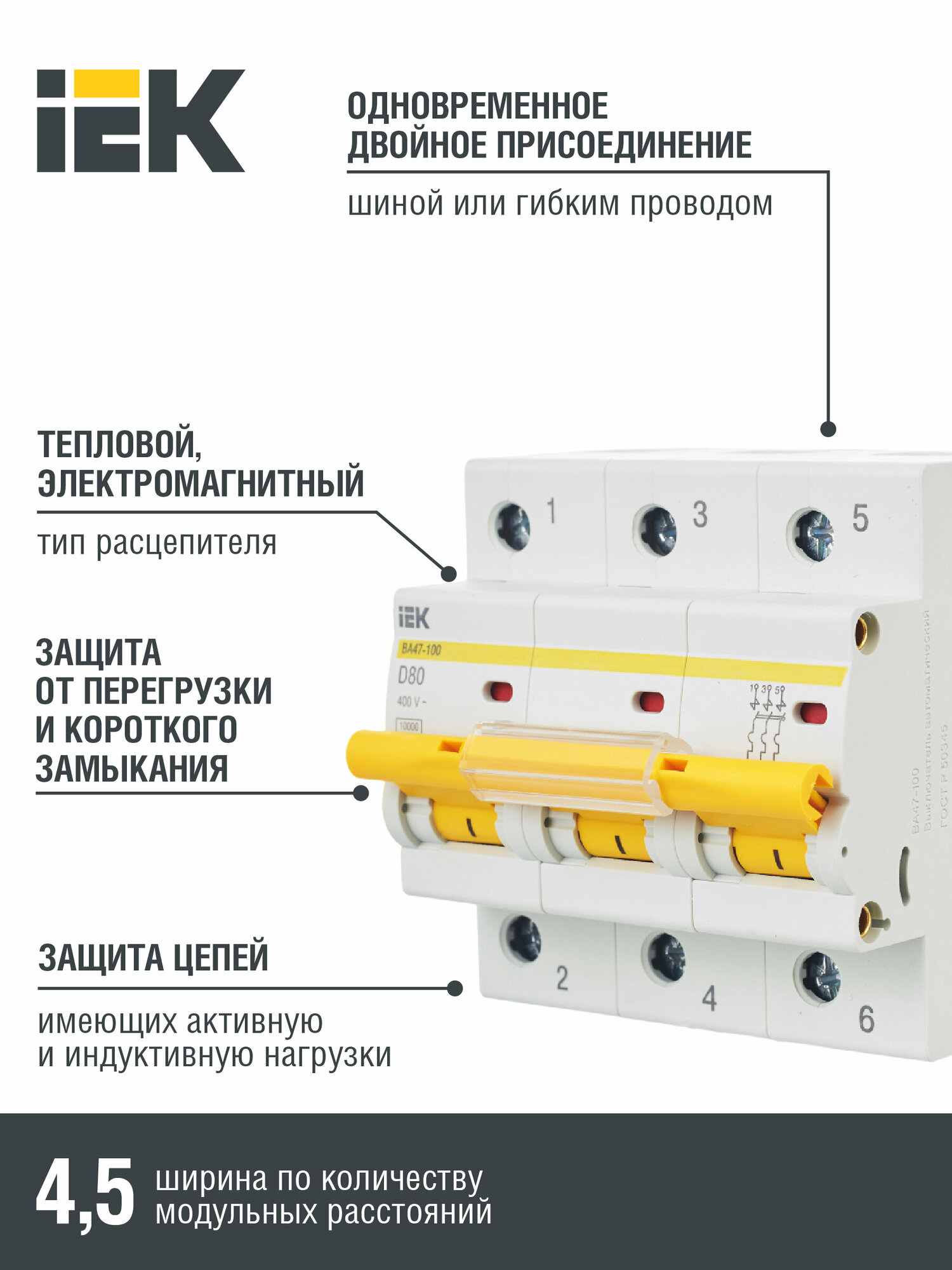 Выключатель автоматический трехполюсный ВА47-100 80А D 10кА MVA40-3-080-D IEK информация: