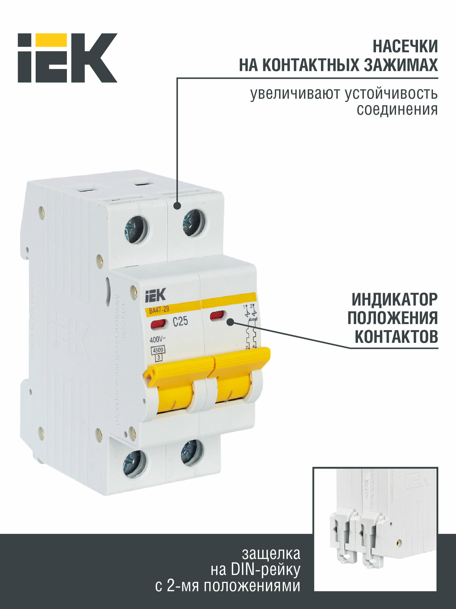 Автоматический выключатель IEK ВА 47-29 (MVA20-2-025-C) 2P 25А тип С 4,5 кА 400 В на DIN-рейку информация: