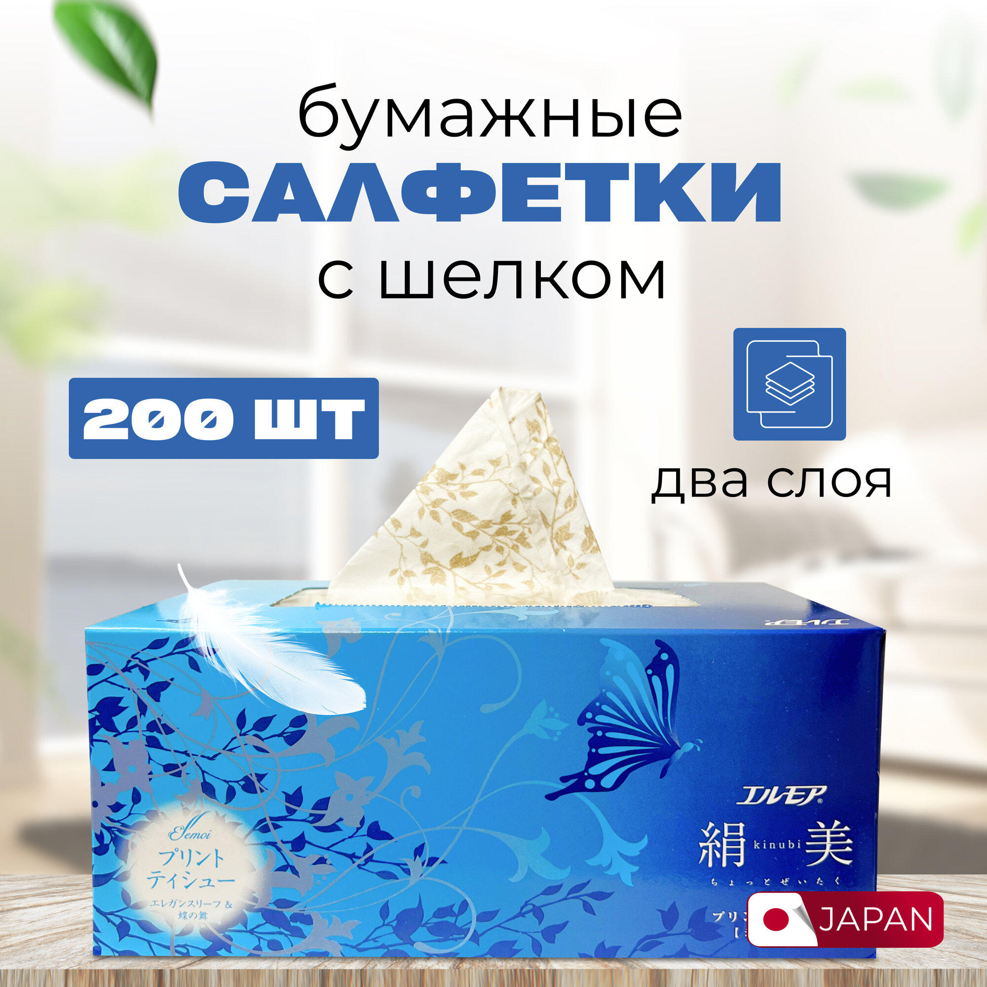 Салфетки бумажные с шелком, двухслойные Kami Shodji ELLEMOI "Kinu-bi", 200 шт, Япония / Салфетки косметические в коробке, японское премиум качество, сухие для всей семьи