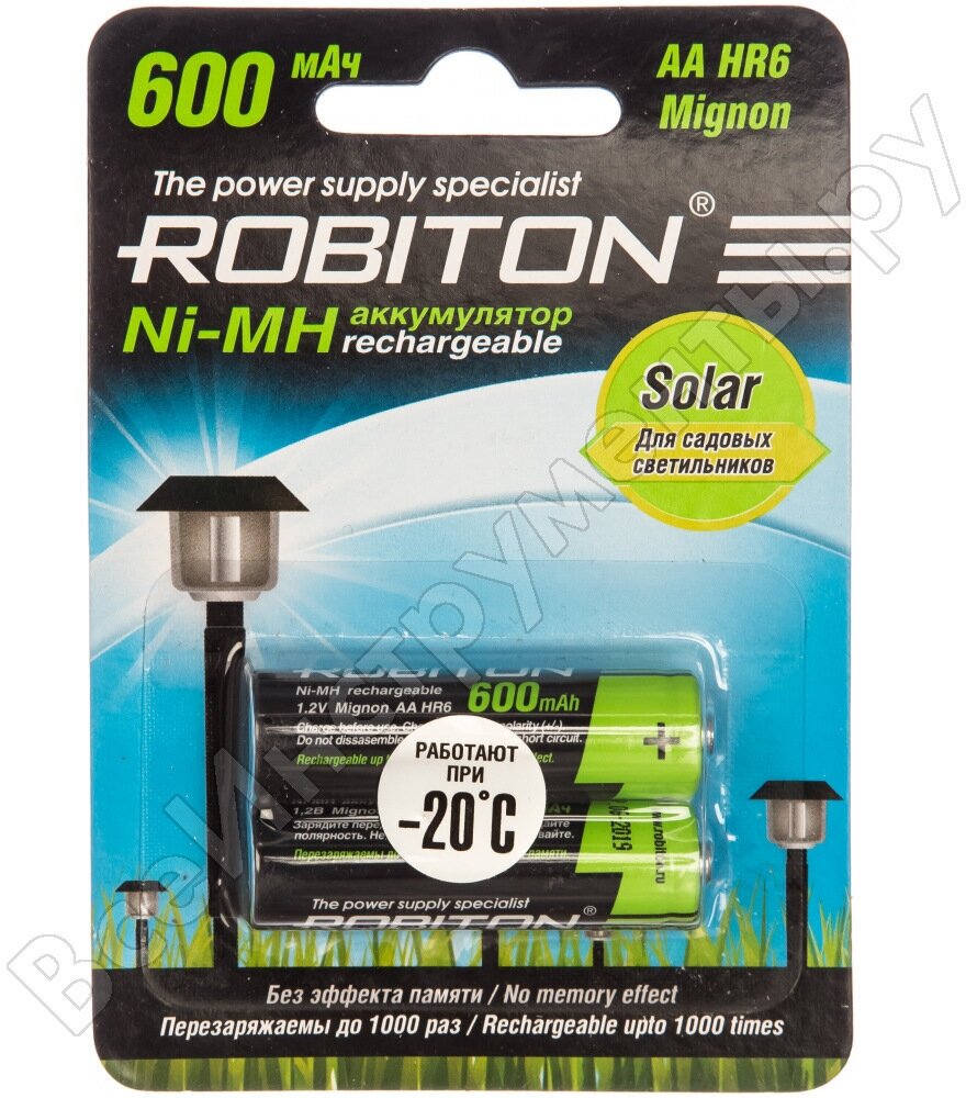 Ni-Mh аккумуляторы ROBITON SOLAR 600MHAA-2 BL-2 13905, 1.2В, 600мАч, размер АА (HR6), металлогидридные, для солнечных светильников, 2шт в упаковке 259 ₽