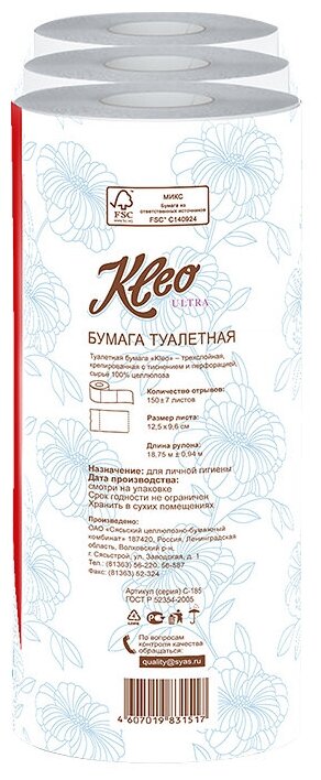 Бумага Туалетная "kleo" 3-СЛ 12 РУЛ БЕЛ С-185 (7) Сясьский .