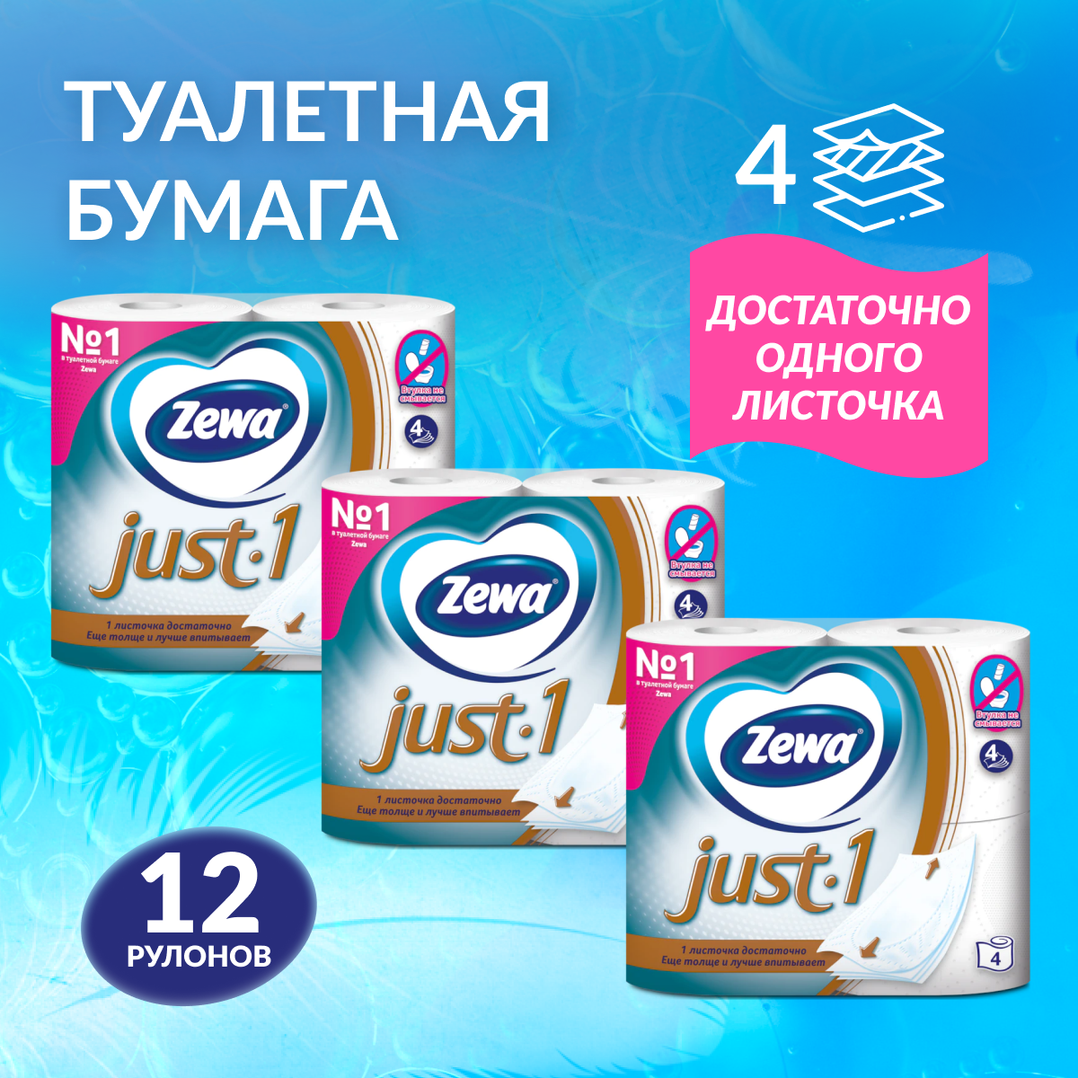 Туалетная бумага Zewa Just 1, 4 слоя, 12 рулонов