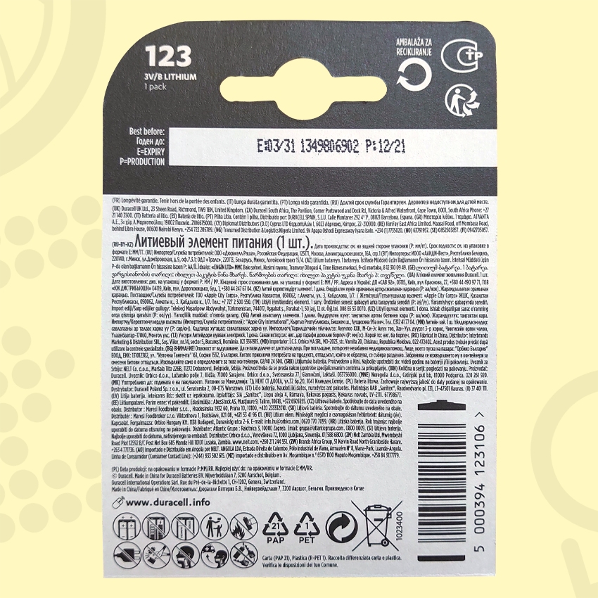 Duracell 123 | 3 вольта, Литиевая батарейка - 2шт. информация: