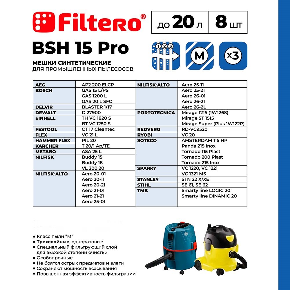 Мешки для пылесоса Bosch, Dewalt, Festool, Flex, Hilti, Nilfisk, Ryobi, Sparky, Stihl, Tmb, Корвет трехслойные синтетические Filtero BSH 15 Pro 20л 5шт 05623