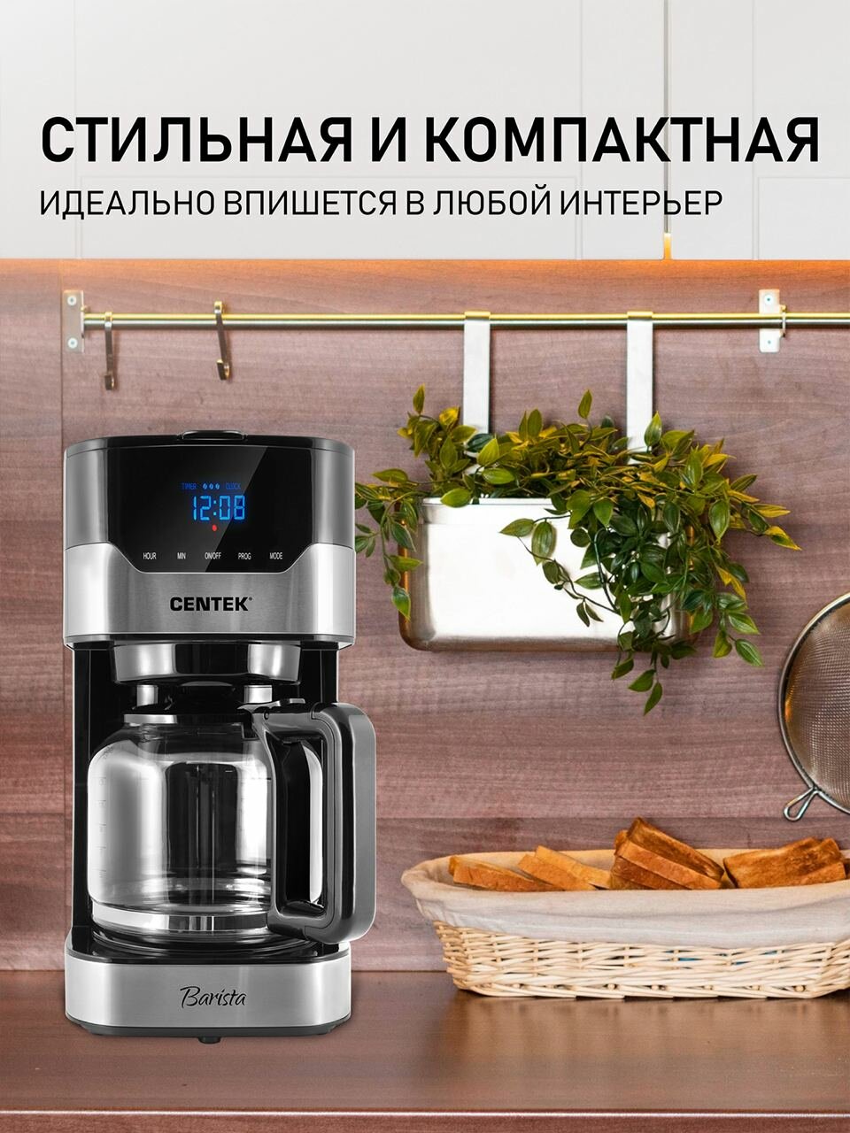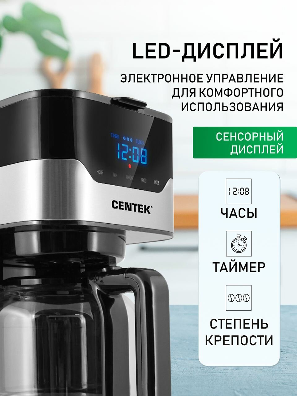 10 цен на Кофеварка CENTEK CT-1145/ сталь/ капельная/ 900 Вт/ 1500 мл/ 3 ур. крепости/ LED/ подогрев