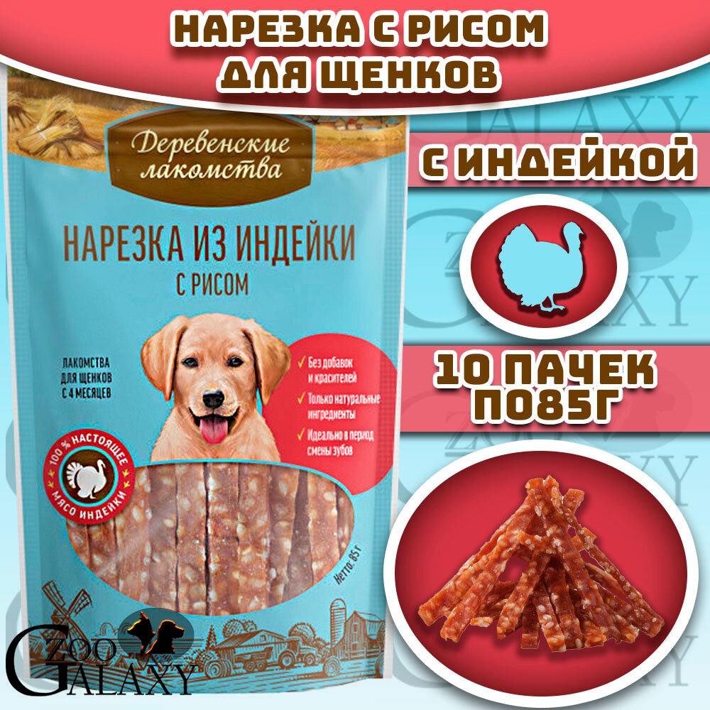 10 цен на Лакомство для собак Деревенские лакомства для щенков Нарезка из индейки с рисом, 85 г. х 10 уп.