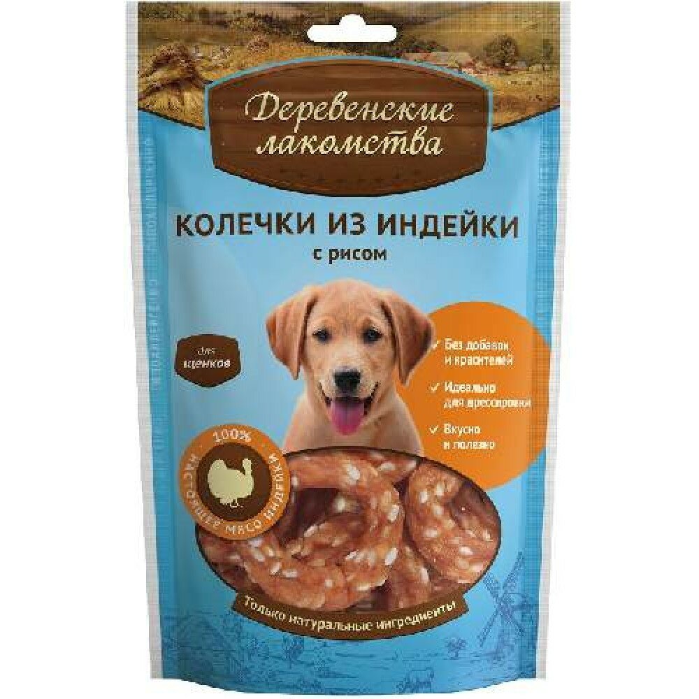 Лакомство Деревенские Лакомства мясные колечки из индейки, для щенков 85г информация:
