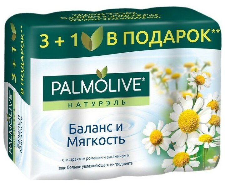 PALMOLIVE Натурэль Баланс и Мягкость туалетное мыло с экстрактом Ромашки и витамином Е 3+1 в подарок, 4*90 г