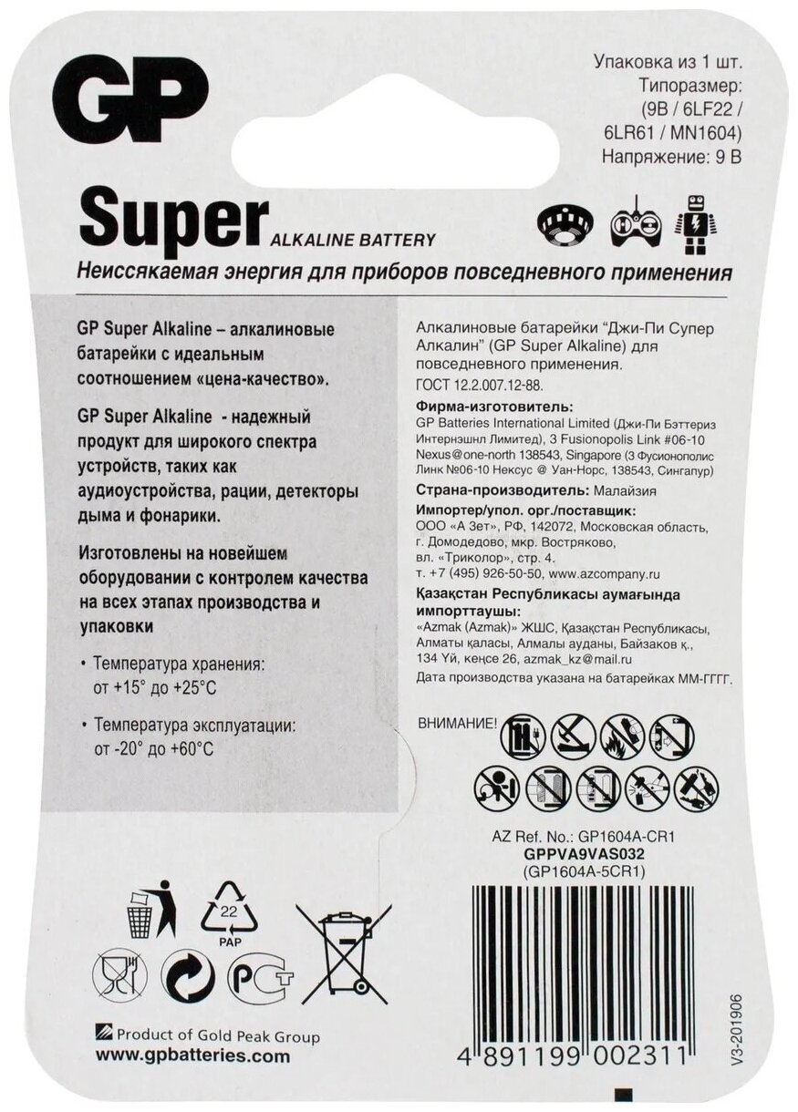 Батарейка GP Super, Крона (6LR61, 6LF22, 1604A), алкалиновая, 1 шт., в пленке, 1604A-5S1 информация: