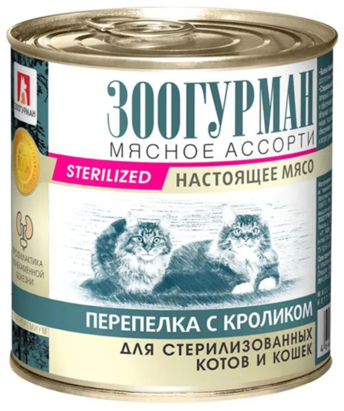 Корм Зоогурман Мясное ассорти Sterilized (консерв.) для стерилизованных кошек, перепелка с кроликом, 250 г x 15 шт