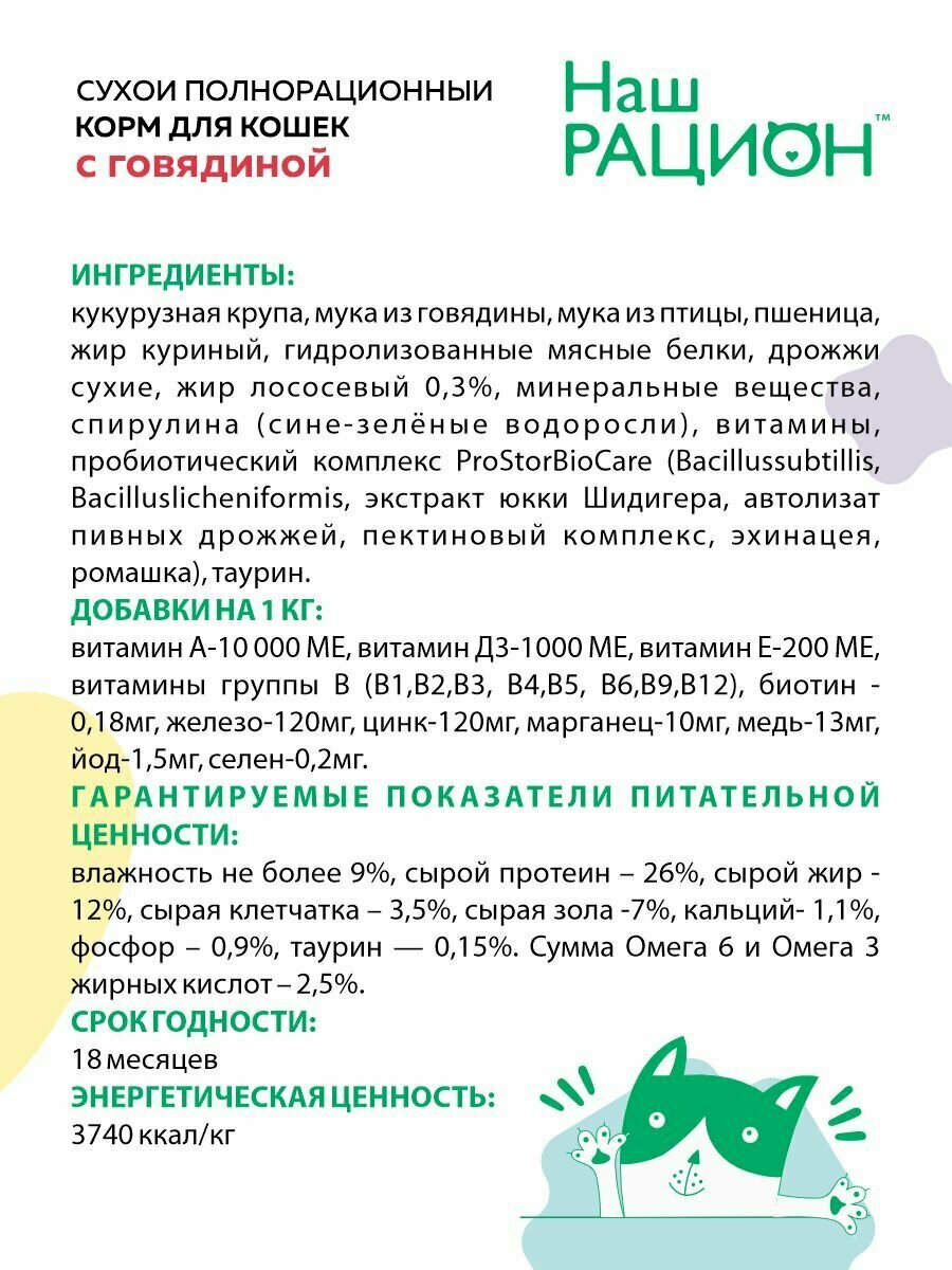 Наш Рацион 1,5 кг сухой корм для взрослых кошек говядина 5 шт информация: