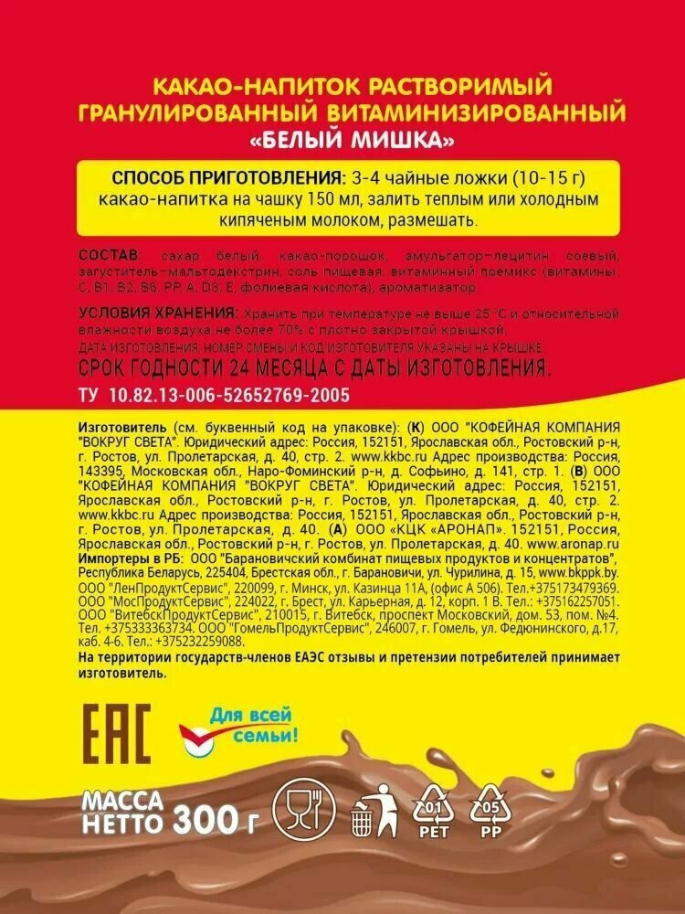 Белый мишка Какао-напиток растворимый гранулированный, 300 г