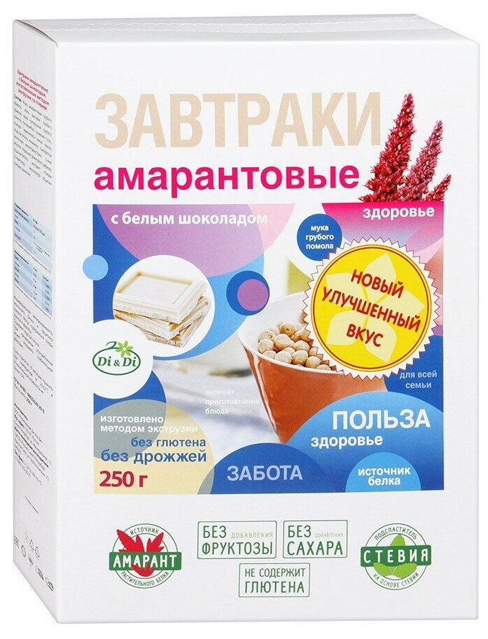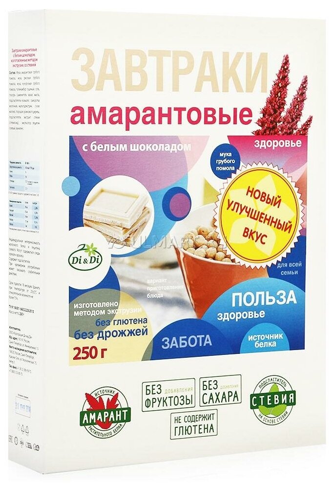 Завтраки амарантовые "Di&Di" с белым шоколадом, 250 гр ( без сахара, без глютена, без дрожжей)