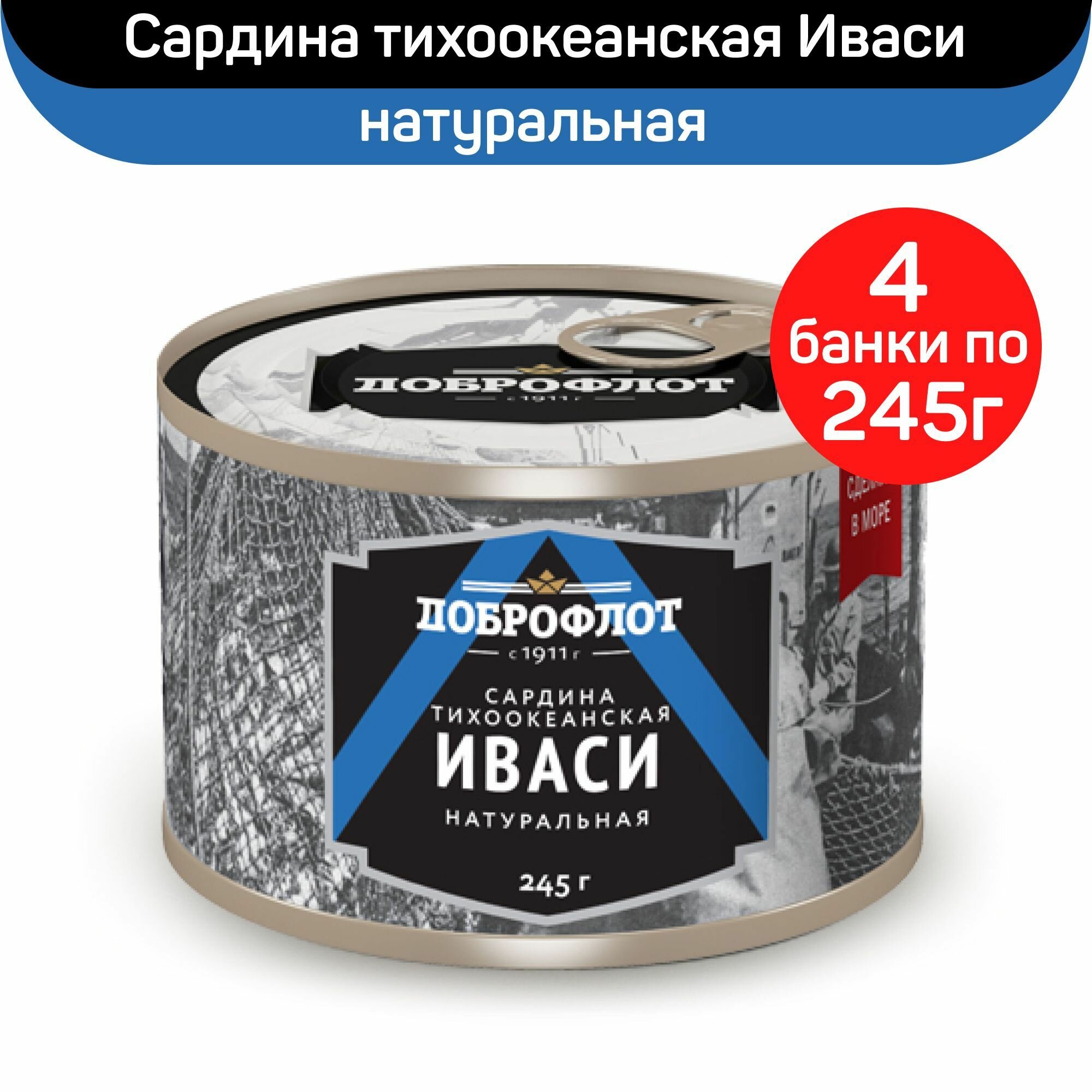 Консервы рыбные "Доброфлот" Сардина тихоокеанская Иваси, натуральная, 4 шт по 245 г