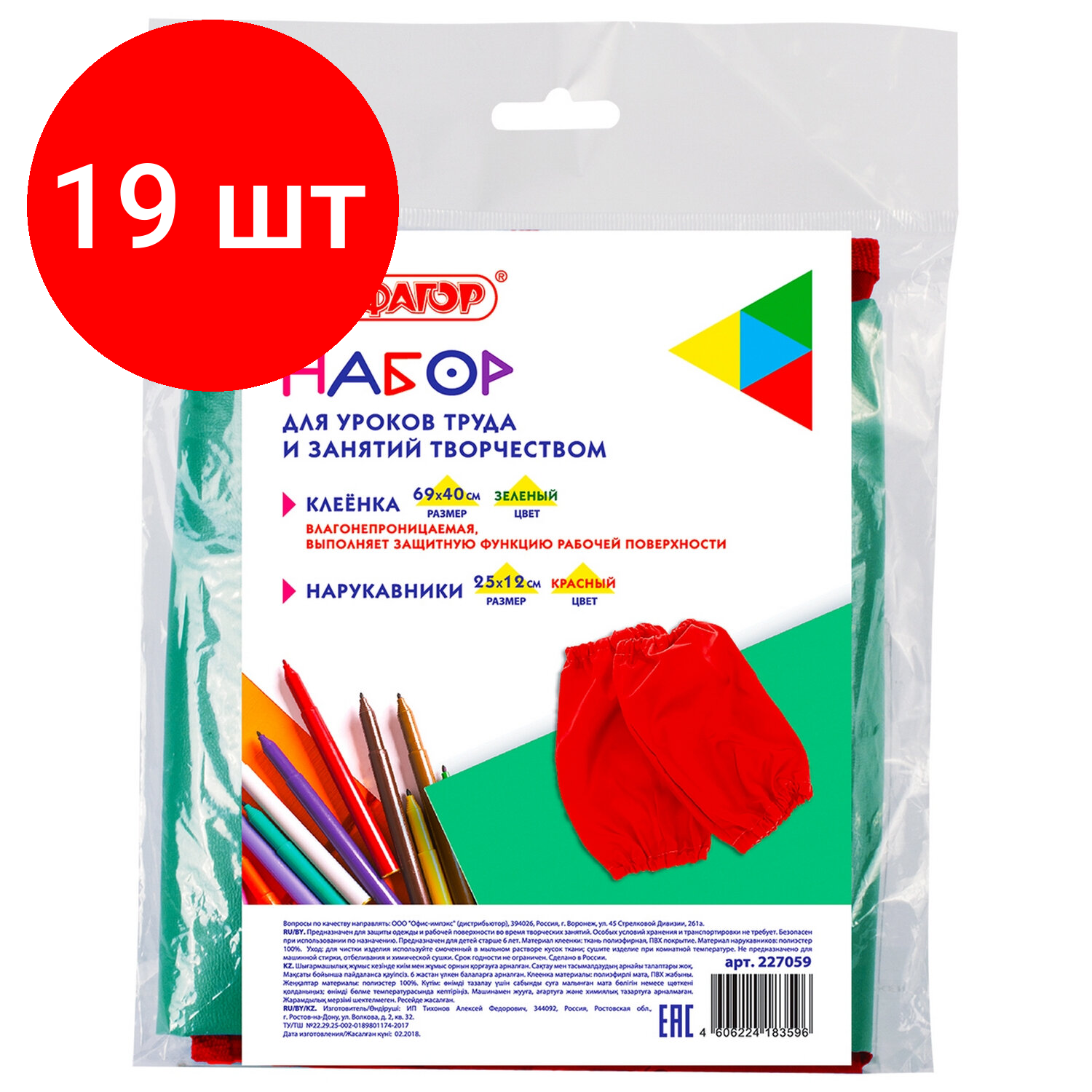Комплект 19 шт, Набор для уроков труда пифагор: клеёнка ПВХ зеленая, 69х40 см, нарукавники красные, 227059 информация:
