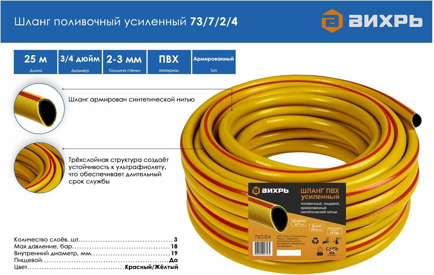 Шланг поливочный ПВХ Вихрь усиленный, пищевой трехслойный армированный 3/4 дюйма 25м информация: