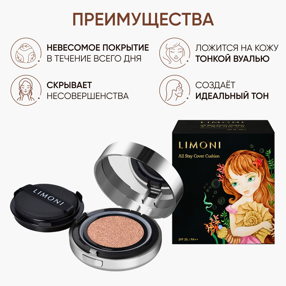 10 цен на Тональный флюид кушон SPF 35 LIMONI All Stay Cover Cushion Sea Princess 02 Medium / вес 15 г