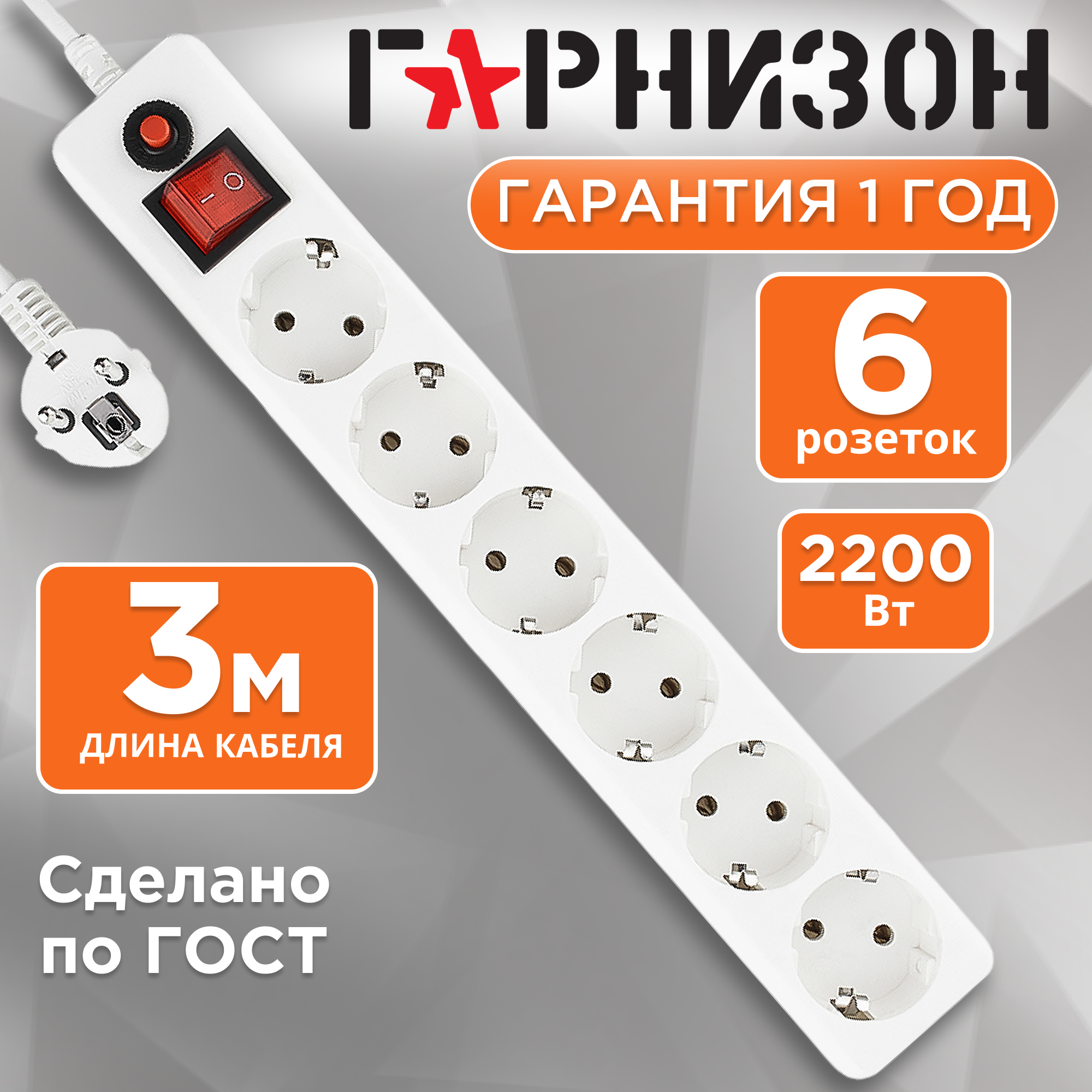 Сетевой фильтр Гарнизон белый 6 розеток 10А 3 метра с уровнем защиты 4 ЕНW-10 611 ₽