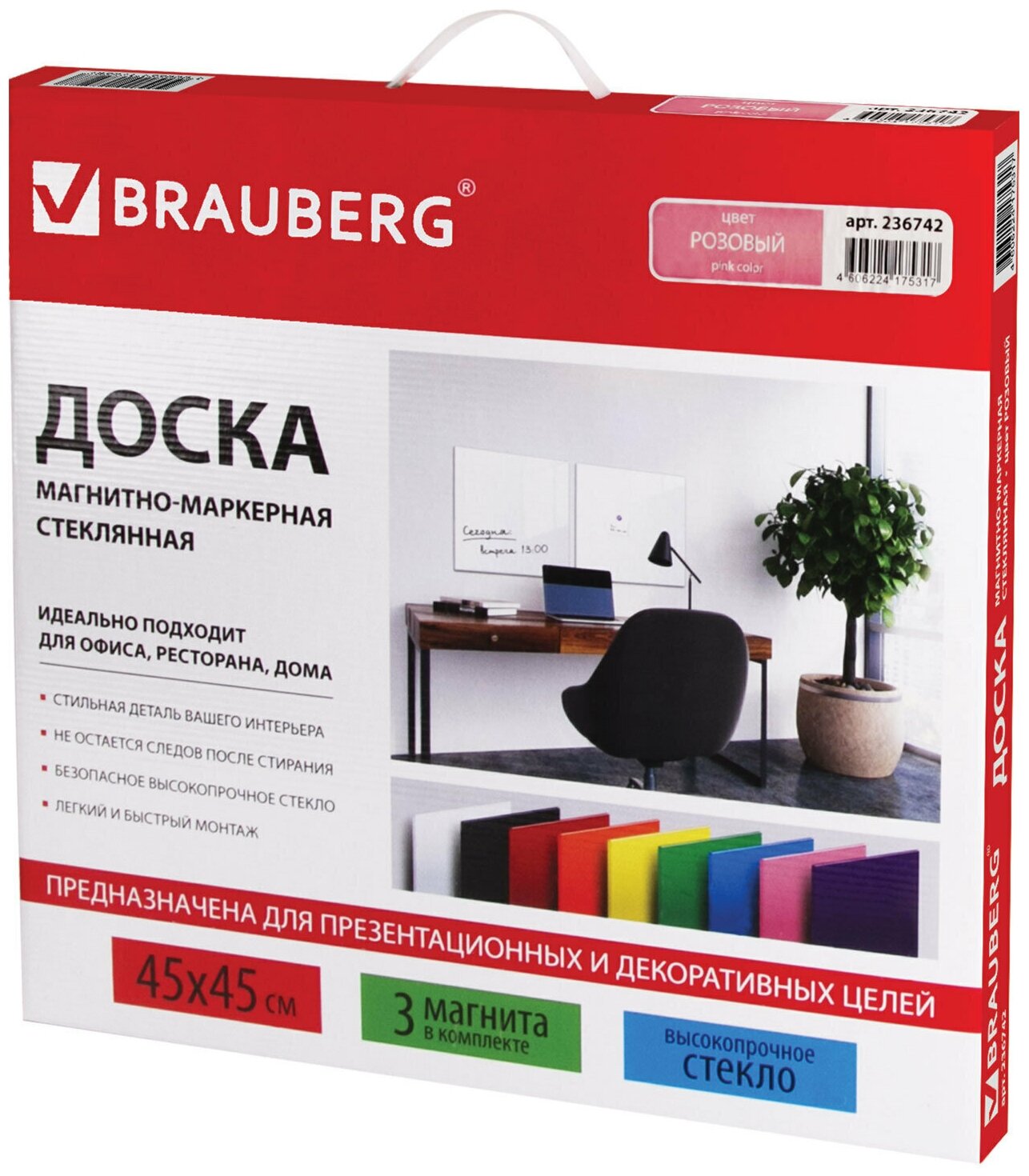 Доска магнитно-маркерная стеклянная 45х45 см, 3 магнита, розовая, BRAUBERG, 236742 (236742) 6 907 ₽
