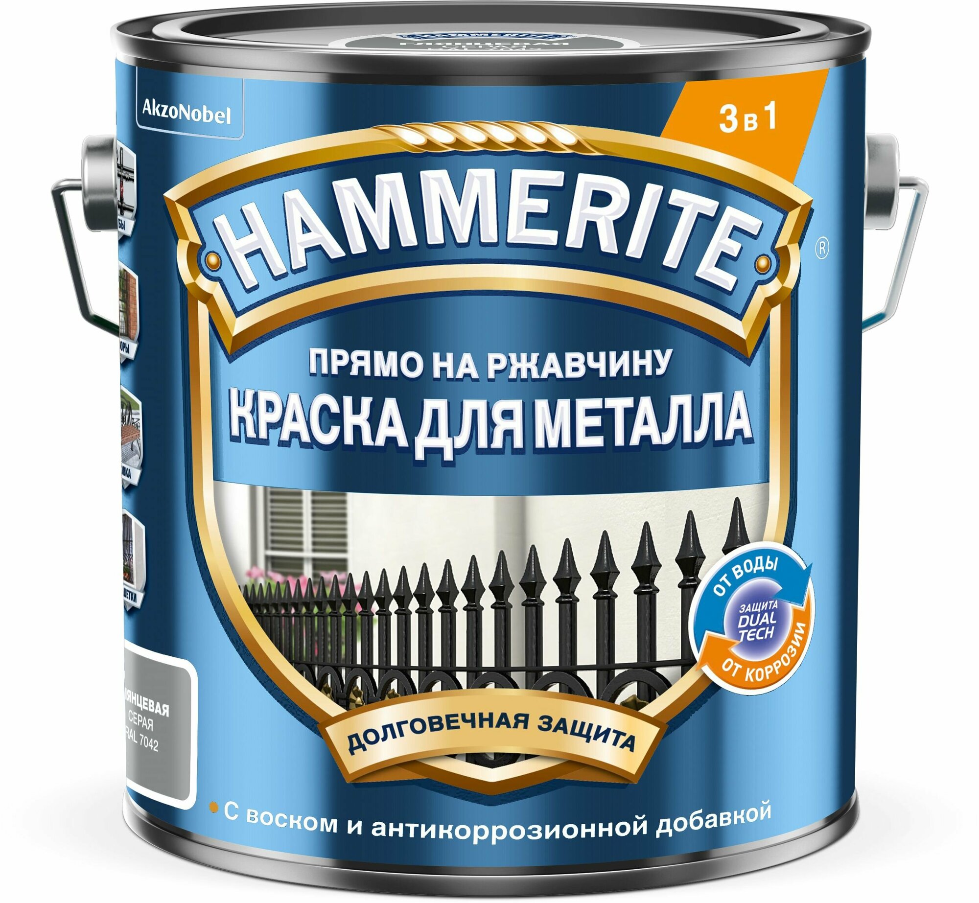 Краска для металла 3 в 1 прямо на ржавчину Hammerite гладкая глянцевая (2л) серый RAL 7042 информация: