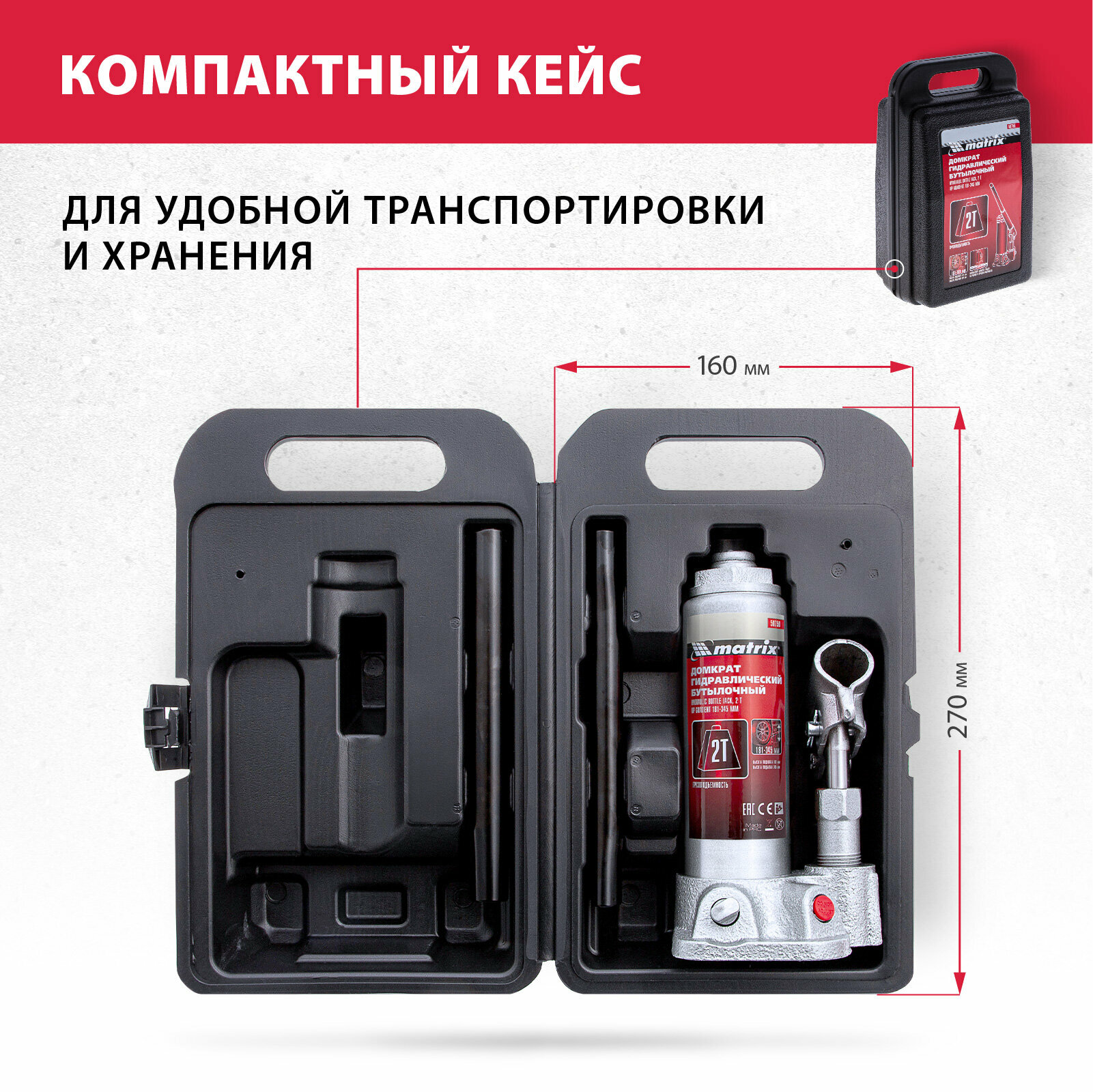 Домкрат гидравлический бутылочный, 2 т, высота подъема 181-345 мм, в пластиковый кейсе Matrix информация: