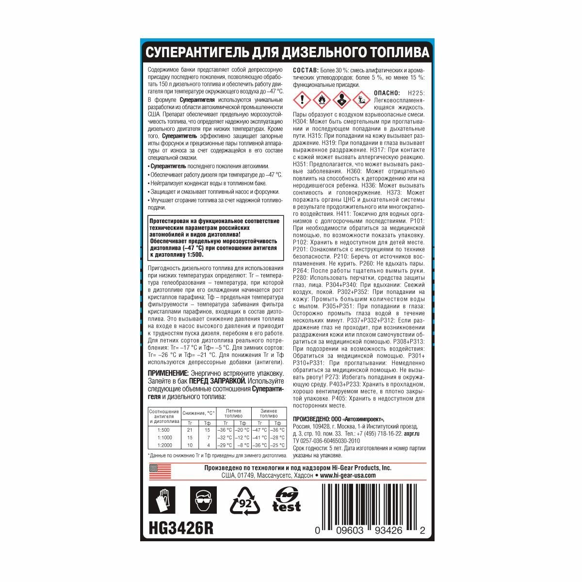 Hi-Gear суперантигель для дизельного топлива HG3426R / 295 мл. информация: