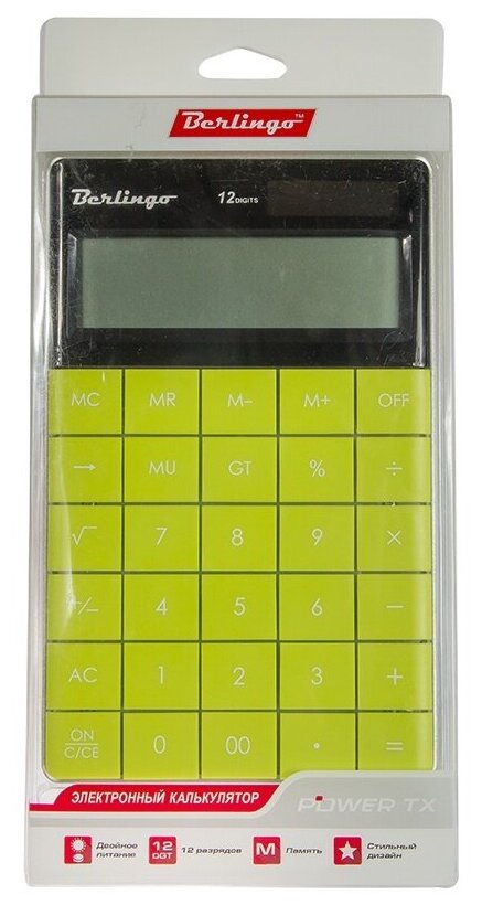 Калькулятор настольный Berlingo "PowerTX", 12 разр., двойное питание, 165*105*13мм, зеленый И 4260107478621