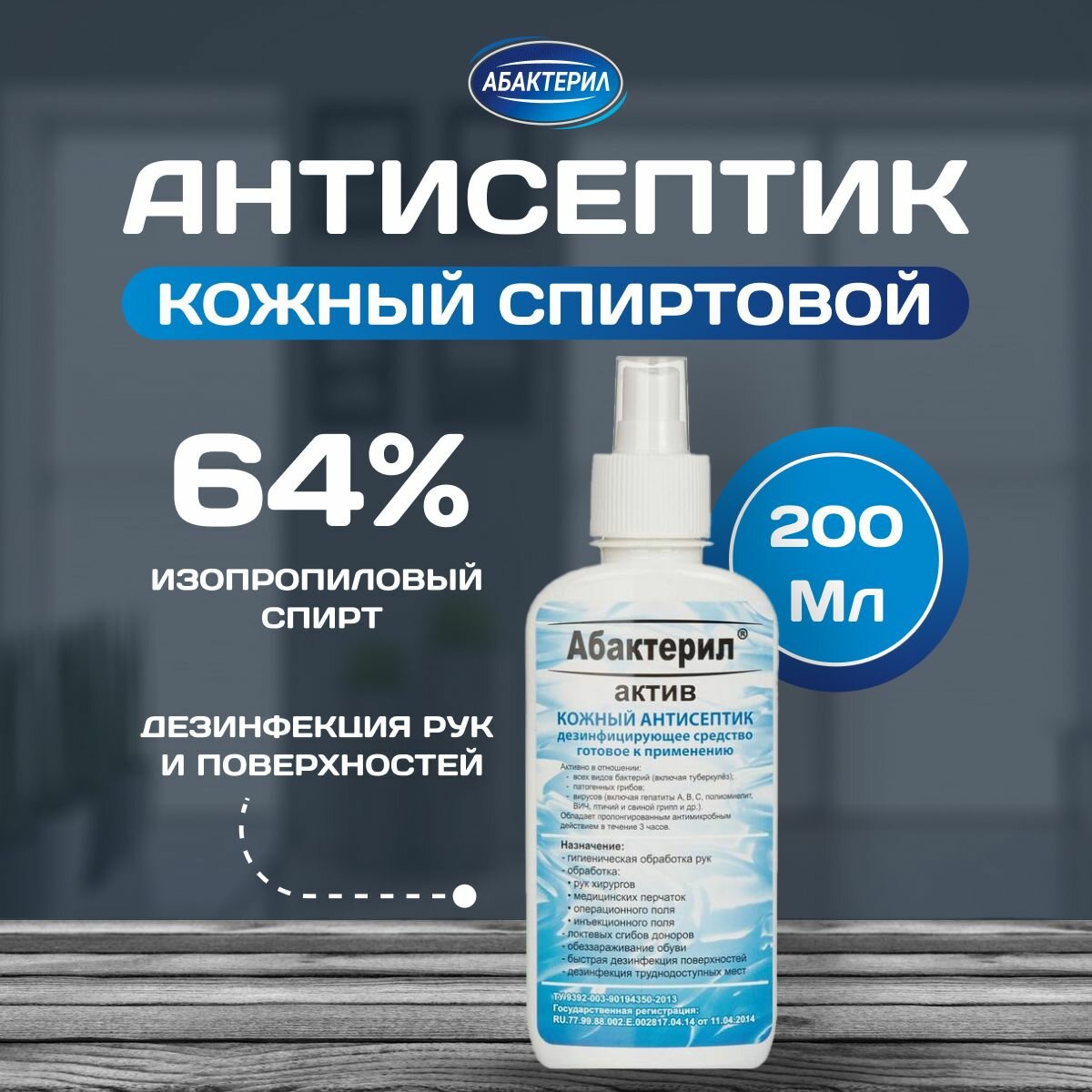 Антисептик для рук и поверхностей спиртосодержащий (64%) с распылителем 750мл абактерил-актив, дезинфицирующий, жидкость, АА-215 Комплект : 1 шт .