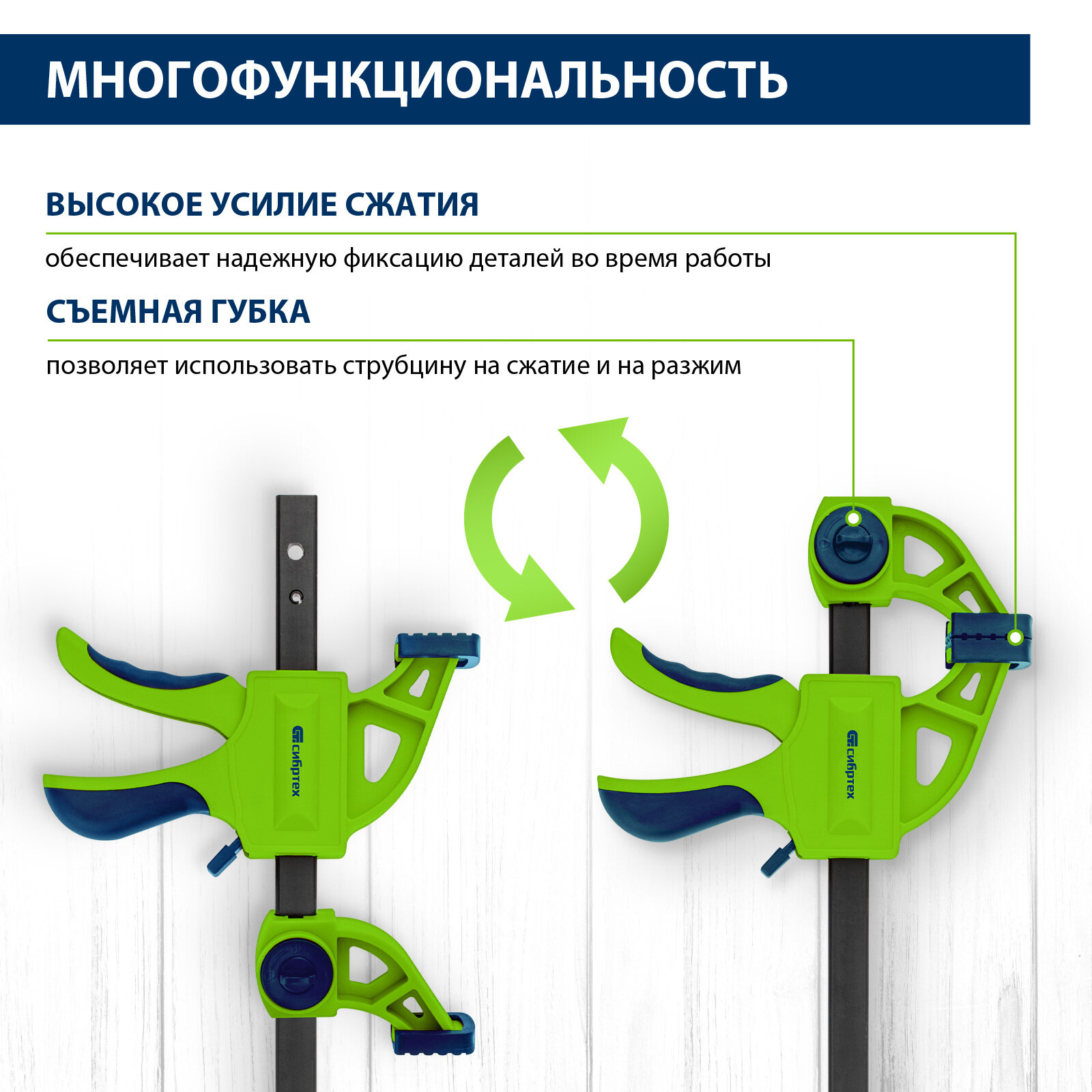 10 цен на Струбцина F-образная Сибртех быстрозажимная, 450х70х660 мм, пласт.корпус, фиксатор, двухкомп. рук-ка 20566