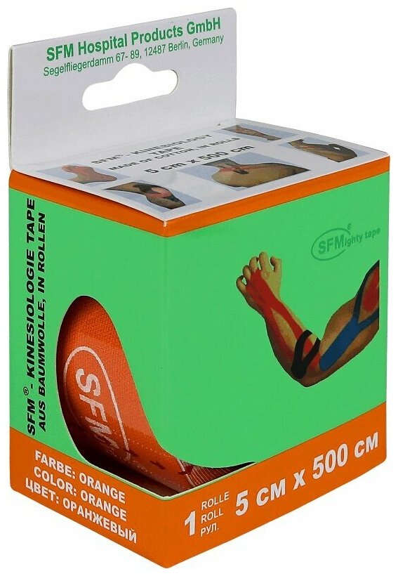 Лента кинезиологическая SFM-Plaster, на хлопковой основе, 5см Х 500см, оранжевого цвета, в диспенсере, с логотипом