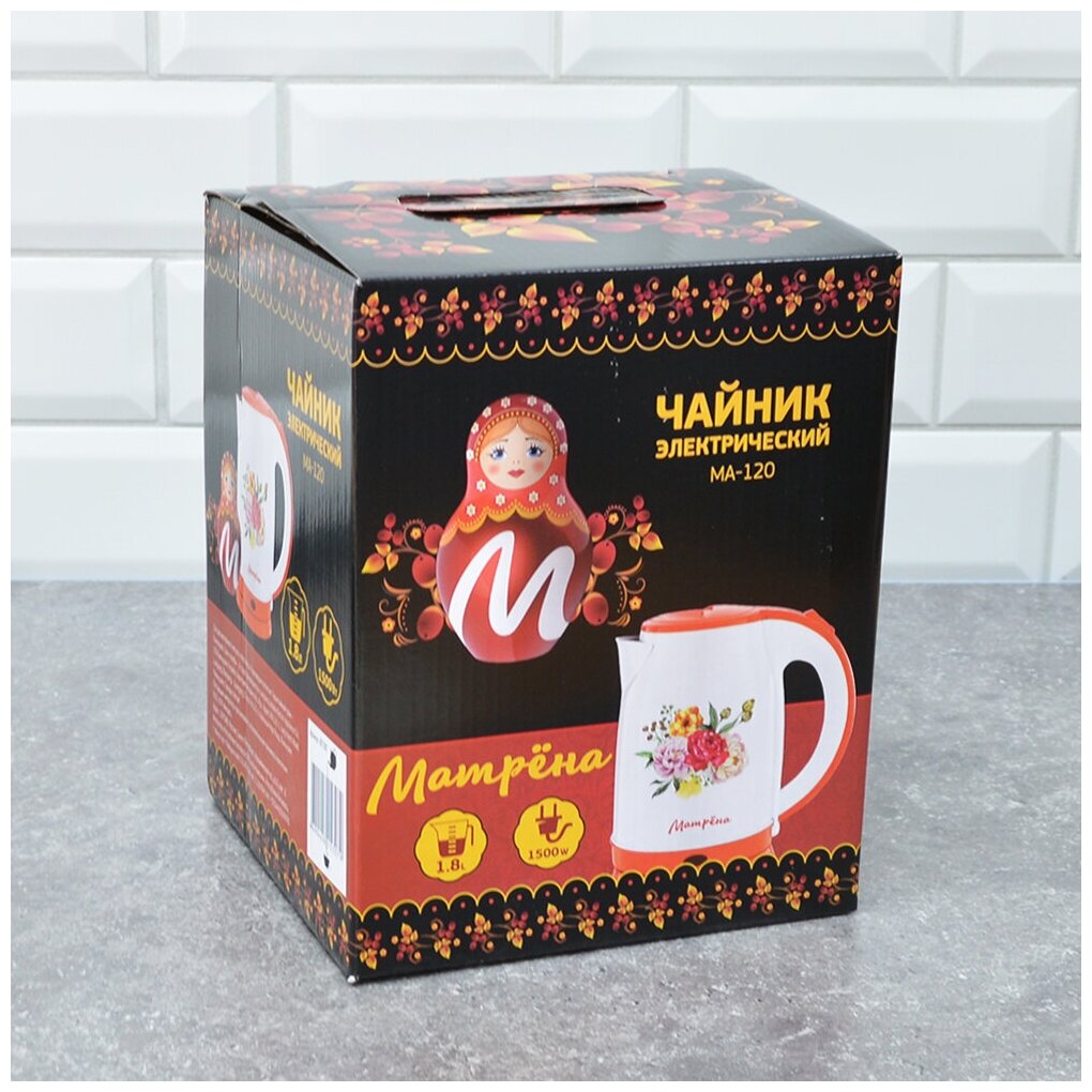 Матрёна Чайник электрический матрёна MA-120, металл, 1.8 л, 1500 Вт, бело-оранжевый с рисунком